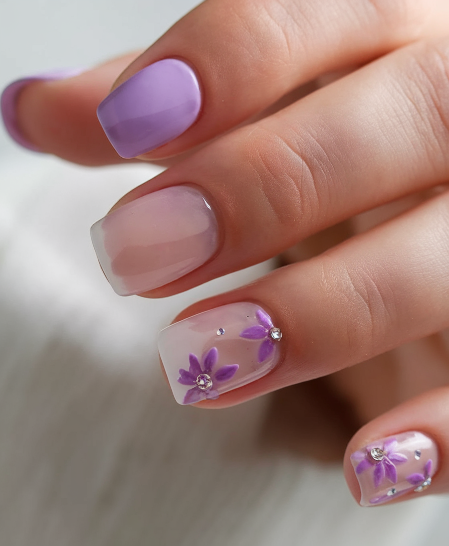 A dreamy mix of pastel lilac and sheer ombré, this design is delicate and romantic. The 3D flowers with rhinestone details add a luxurious touch, making it a standout choice for ideas blue lovers. The squoval shape and glossy finish enhance the feminine elegance of this look. If you want ideas white with a soft, floral aesthetic, this is a must-try for simple spring nails 2025.