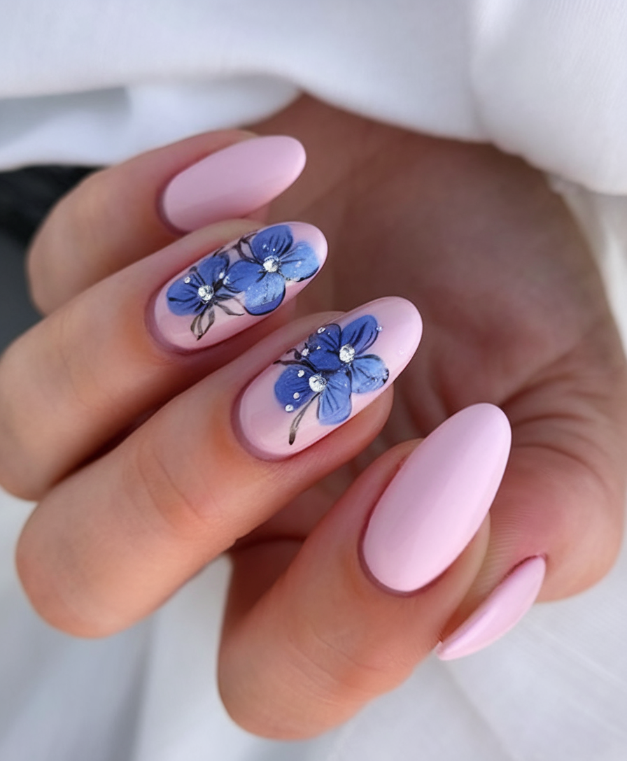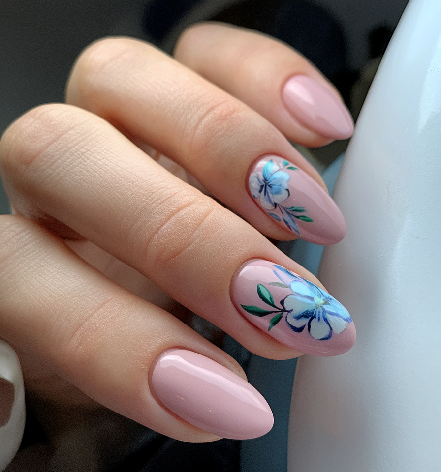 This design combines a soft pink base with intricate hand-painted flowers in ideas blue tones. The floral accents on select nails add a delicate and artistic touch, making this a fresh take on spring-inspired ideas 2025. The ideas oval shape enhances the natural elegance of the look. If you’re searching for a chic yet understated inspo, this manicure is a perfect choice.