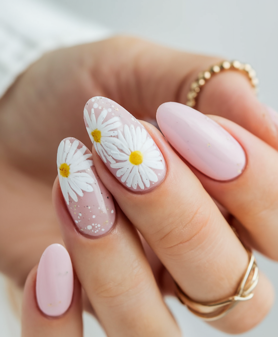 This design features a delicate pastel pink base with hand-painted flowers for a fresh spring look. The daisy accents, combined with a subtle speckled detail, add a playful yet elegant touch. The ideas oval shape enhances the femininity of this manicure, making it a super choice for Easter or everyday wear. If you’re searching for ideas white with a floral twist, this is a perfect inspo.