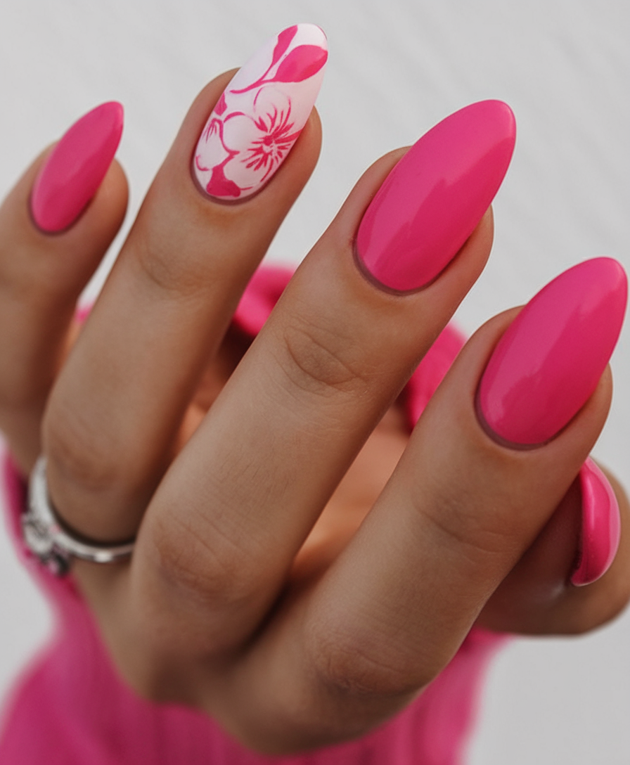 This design pairs a striking pink base with a single floral accent nail for a stylish contrast. The hand-painted flowers in soft ideas white and pink add an artistic, feminine touch to this bold look. The ideas oval shape enhances the overall elegance, making it a chic yet playful choice. If you’re looking for ideas 2025 with a fun and trendy twist, this is a standout option.
