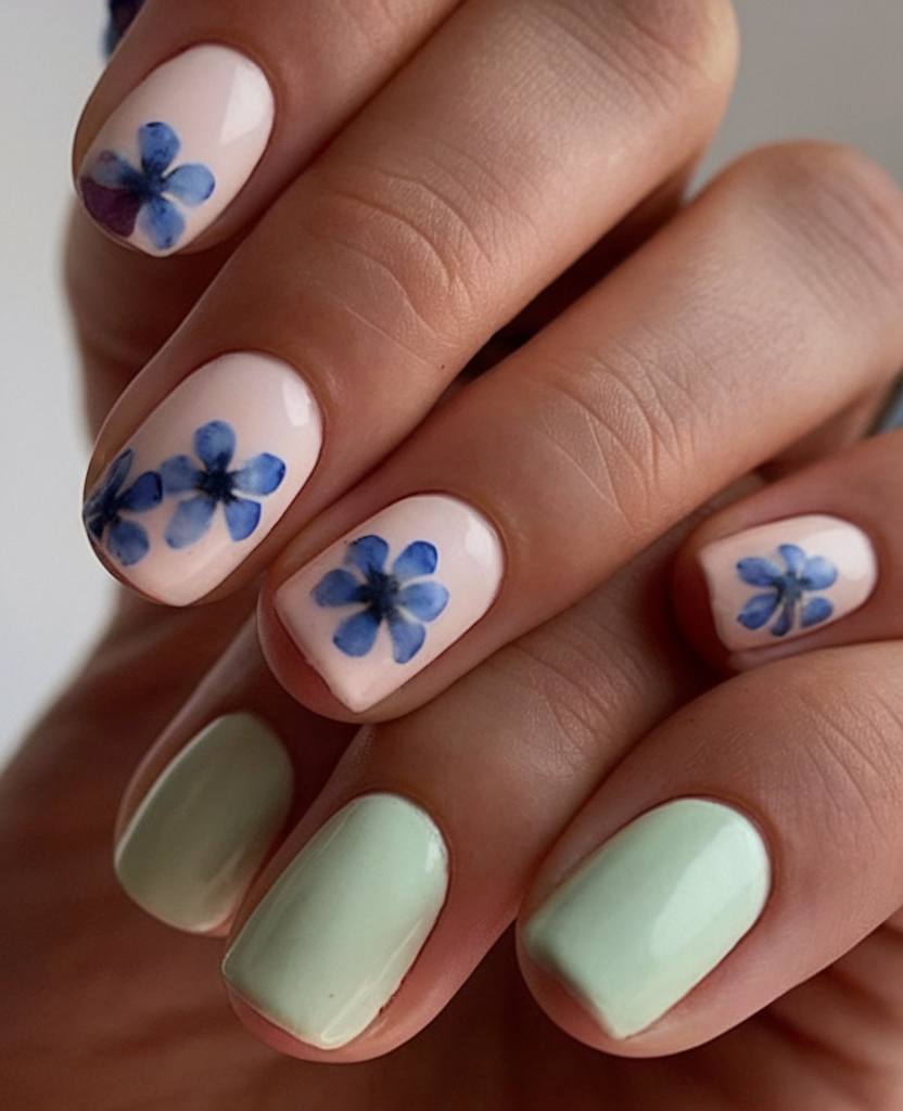 This design combines soft ideas green with creamy nude tones, featuring watercolor-style flowers in ideas blue. The squoval shape and glossy finish give this manicure a fresh and airy look, perfect for simple spring nails 2025. The hand-painted floral details add an artistic touch, making it a unique yet understated ideas 2025 option. If you want something soft yet stylish, this is a great inspo.