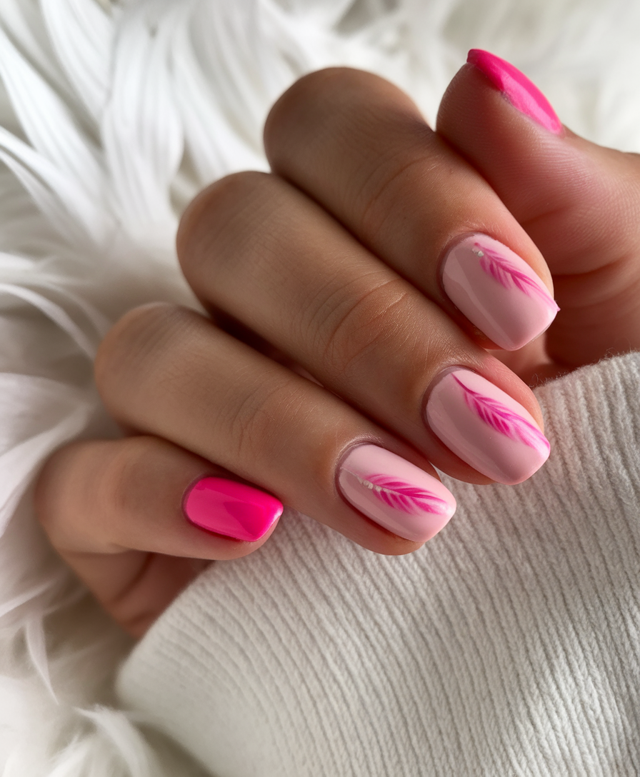 A modern twist on ideas pink, this design features a soft blush base with feather-like hot pink details for a bold contrast. The plain glossy finish keeps the look clean and stylish, while the squoval shape enhances its wearability. One vibrant accent nail in hot pink ties the whole set together. If you’re looking for ideas 2025 with a mix of soft and bold, this is a standout look.