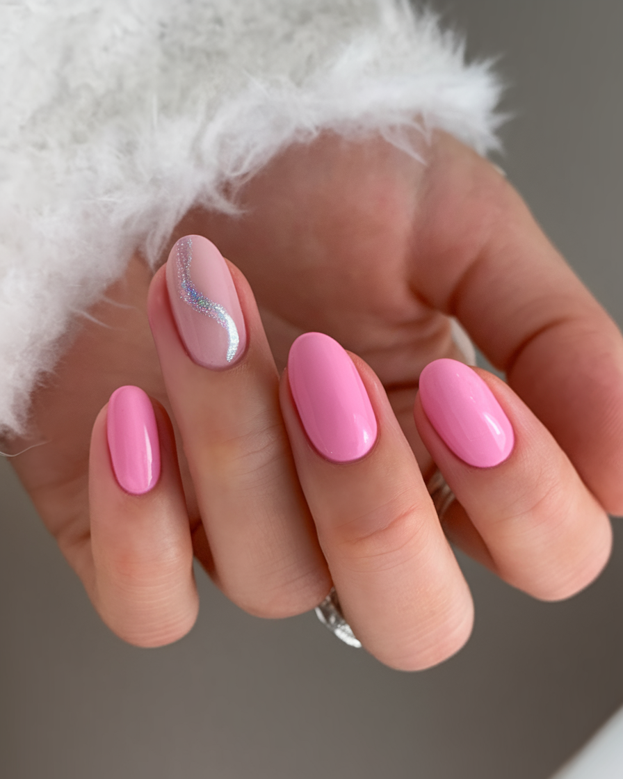 This simple spring nails 2025 look is all about elegance with a glossy pink finish. One accent nail features a soft wavy silver chrome detail, adding a touch of sparkle to an otherwise plain yet trendy manicure. The ideas oval shape makes this super flattering for all nail lengths. Perfect for those searching for ideas pink, ideas white, or an effortless inspo for spring.