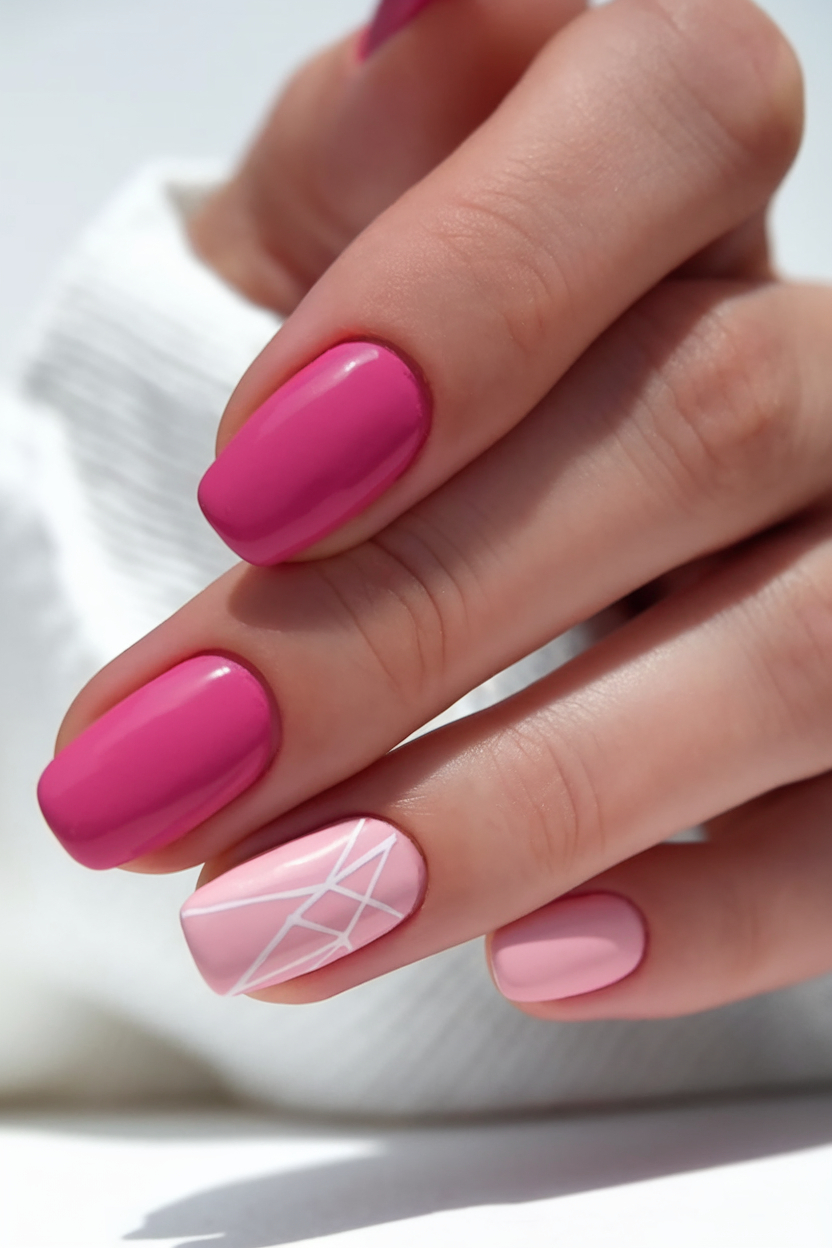 This design features a striking combination of deep and soft pink shades, creating a bold yet feminine look. The geometric white line art on the accent nail adds a super modern touch, making it a great choice for those looking for fresh ideas pink. The squoval shape enhances the elegance of the plain glossy finish. If you’re searching for ideas 2025 with a trendy yet wearable twist, this manicure is a must-try.