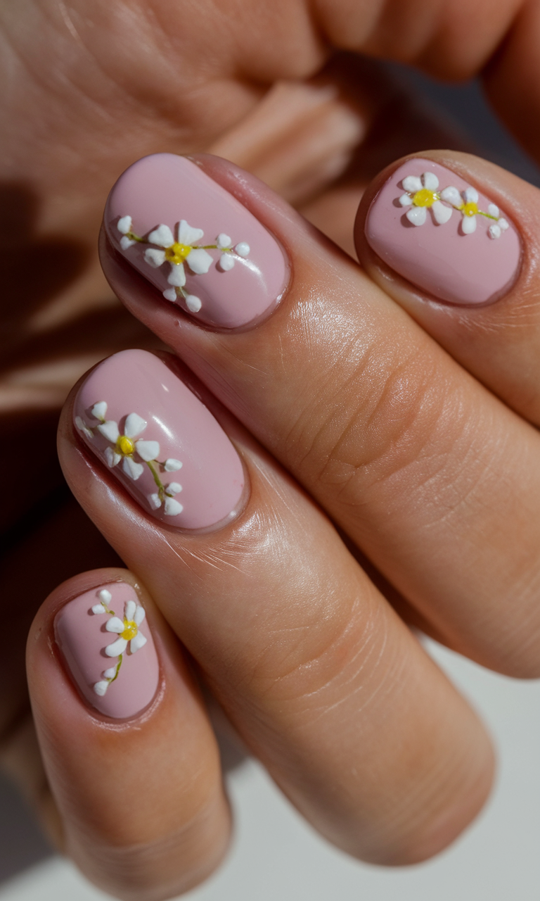 For a soft and charming spring look, these simple spring nails 2025 feature a muted pastel pink base with tiny hand-painted flowers. The white and yellow daisies give off a fresh Easter vibe, making this one of the best ideas white for the season. The medium length and squoval shape make the manicure practical yet stylish. Perfect for those who love a floral inspo while keeping things minimal.