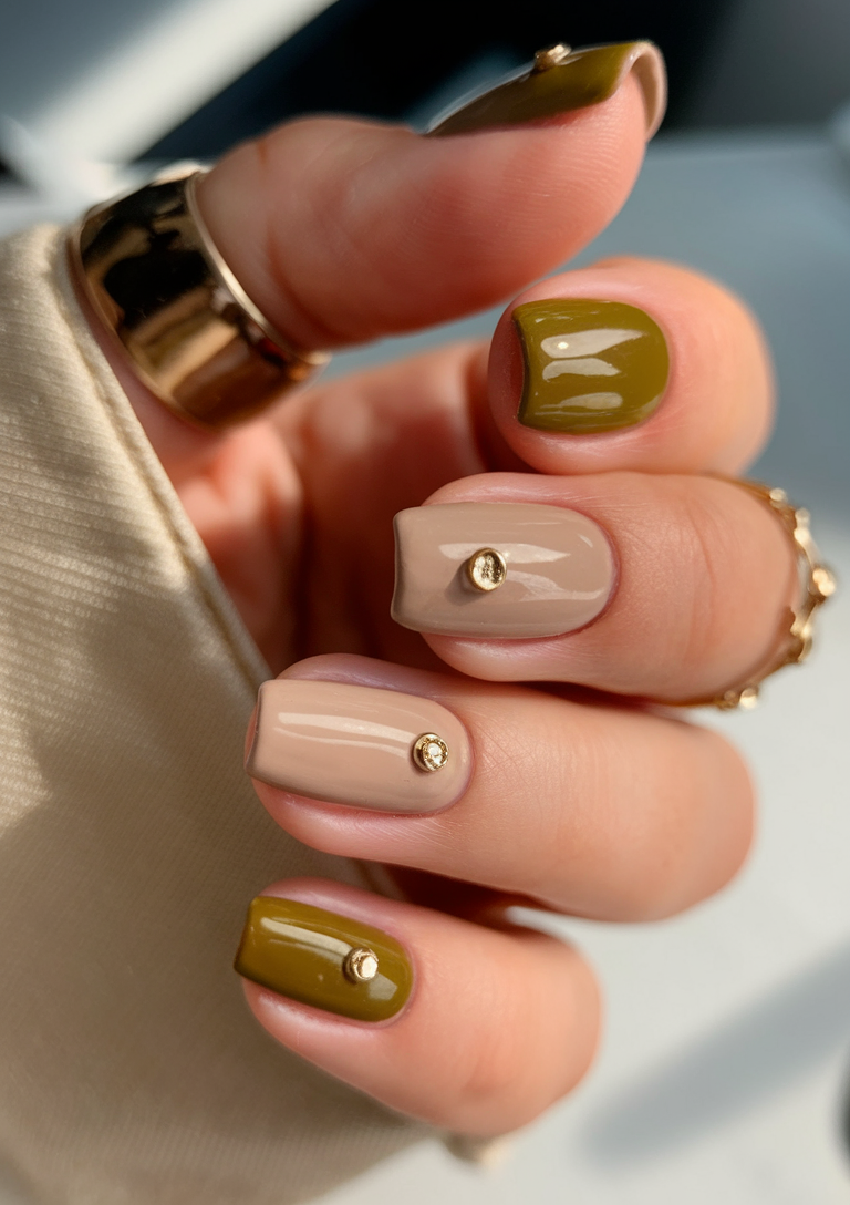 This design combines earthy ideas green with a soft beige color, creating a unique and sophisticated look. Gold metallic studs add an elegant touch, elevating the plain glossy finish into something very stylish. The squoval shape and medium length keep the manicure versatile for any occasion. If you’re looking for ideas 2025 that mix elegance with modern charm, this set is a perfect choice.