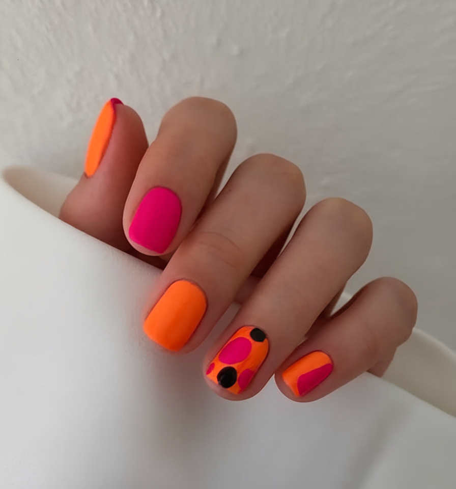 This design is a bold and playful take on simple spring nails 2025, featuring vibrant orange and deep pink tones. The abstract black and pink shapes on one nail add an artistic touch, making it a fun ideas 2025 choice. The medium length and squared-off edges enhance the modern feel of this colorful sets look. If you love bright, eye-catching ideas red, this manicure is a must-try.