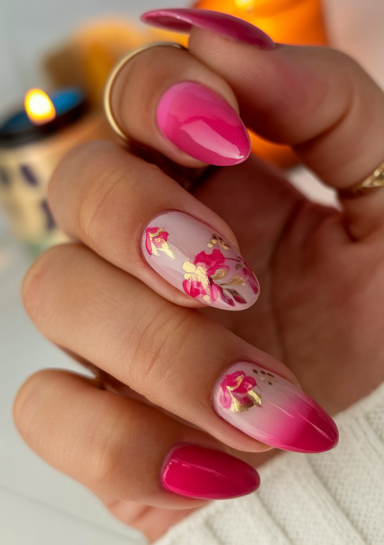 This ideas oval manicure blends soft and bold pink shades into a seamless ombre, creating a romantic spring look. The delicate flowers with hand-painted gold accents add an artistic and luxurious feel to this design. The medium almond shape enhances the elegance, making it a stunning choice for ideas 2025. If you’re looking for floral inspo that feels modern and feminine, this is the perfect manicure.