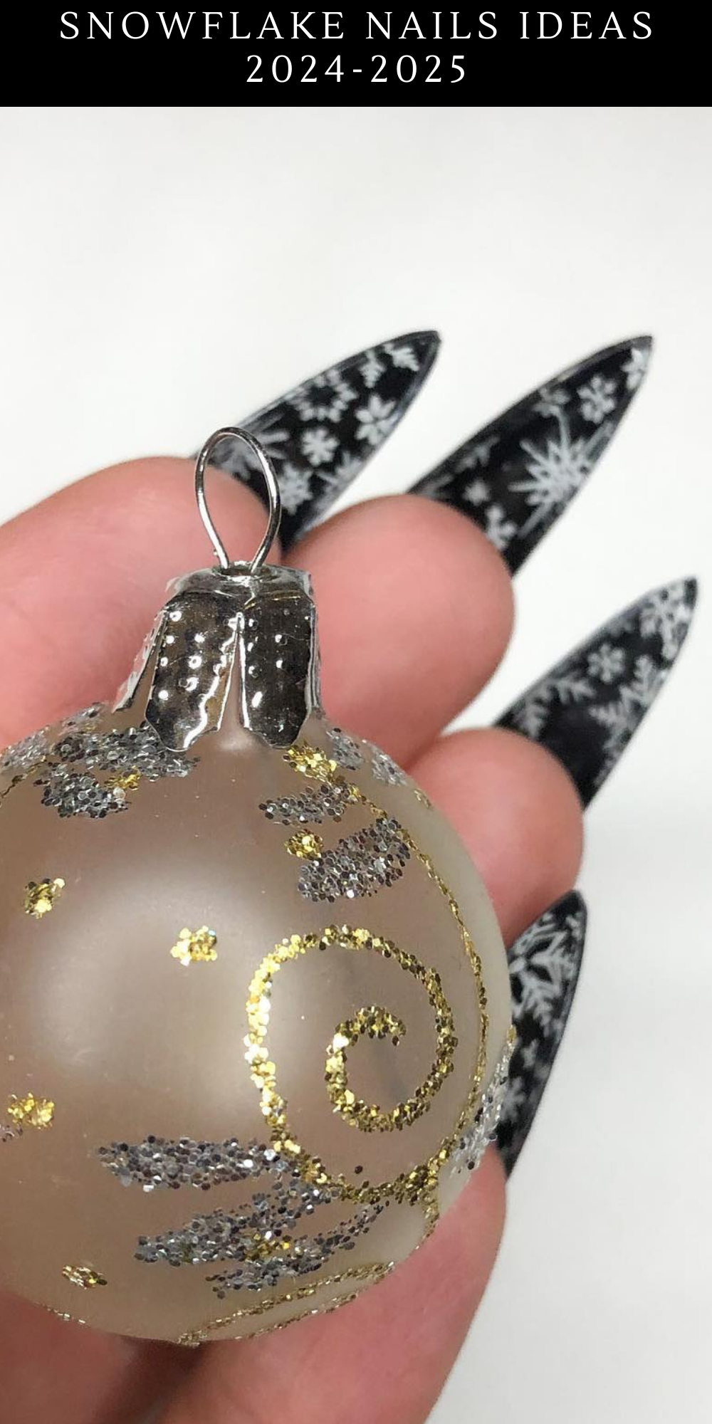 A sleek black stiletto manicure with white snowflake patterns creates a striking winter look. The sharp shape and dark polish offer a bold contrast to the delicate snowflake art. Ideal for anyone wanting a dramatic and festive nail design.