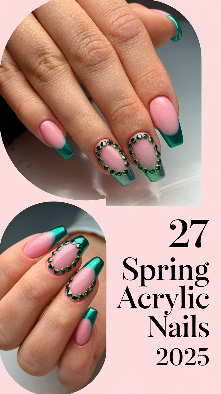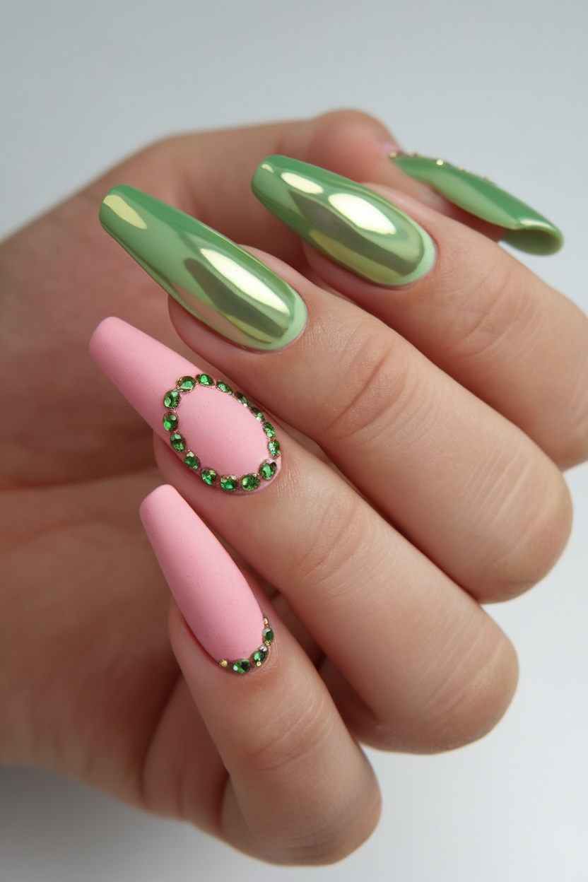 This designs coffin set blends high-shine chrome green with soft matte pink for a bold contrast. The glossy metallic effect on the green nails creates a futuristic look, while the pink matte nails add a soft, velvety touch. Green rhinestones outline an oval accent, bringing a simple classy elegant detail to the design. This unique combination is a standout choice for spring acrylic nails ideas 2025, perfect for those who love mixing textures.