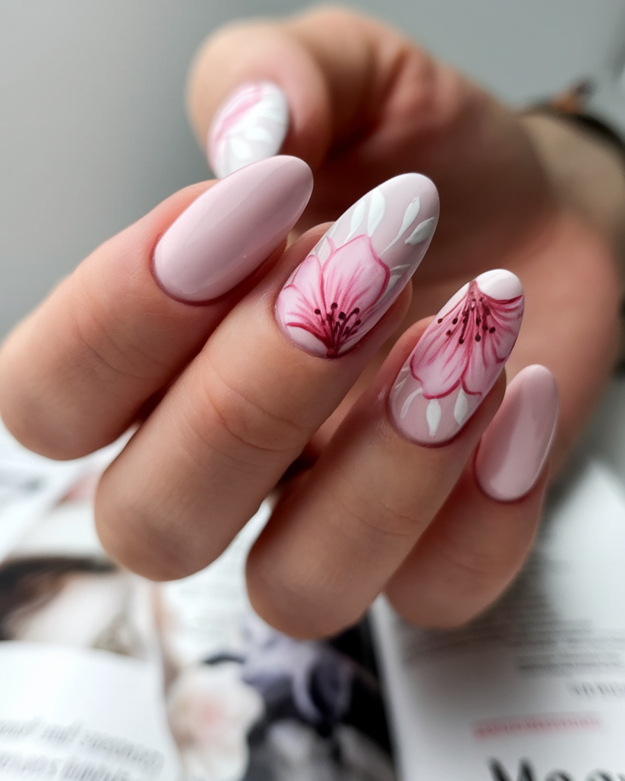 This delicate designs almond set features soft pink acrylic nails with a combination of solid and floral designs. The simple classy elegant touch of hand-painted flowers on a sheer white base makes this look fresh and feminine. The soft pastel color complements various outfits, making it a great inspo for spring. The subtle gloss finish enhances the beauty of this simple yet detailed artwork.