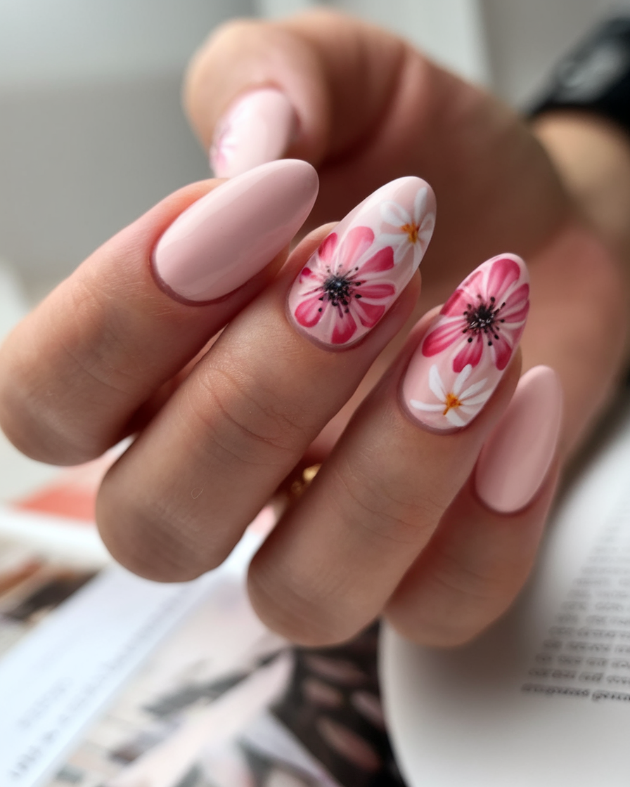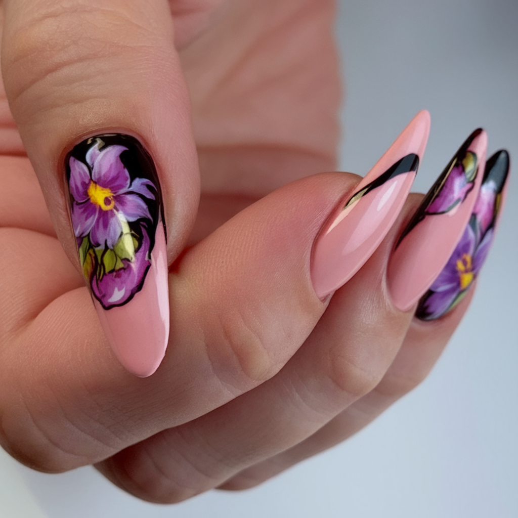 This designs almond set brings drama with its hand-painted floral artwork on a glossy pink base. The deep purple flowers, outlined in black, create a striking contrast, while the subtle black tip detail adds a modern twist. The simple classy elegant combination of soft pink and dark accents makes this a perfect spring acrylic nails ideas 2025 choice. Ideal for those who want a balance of artistic and sophisticated elements in their manicure.