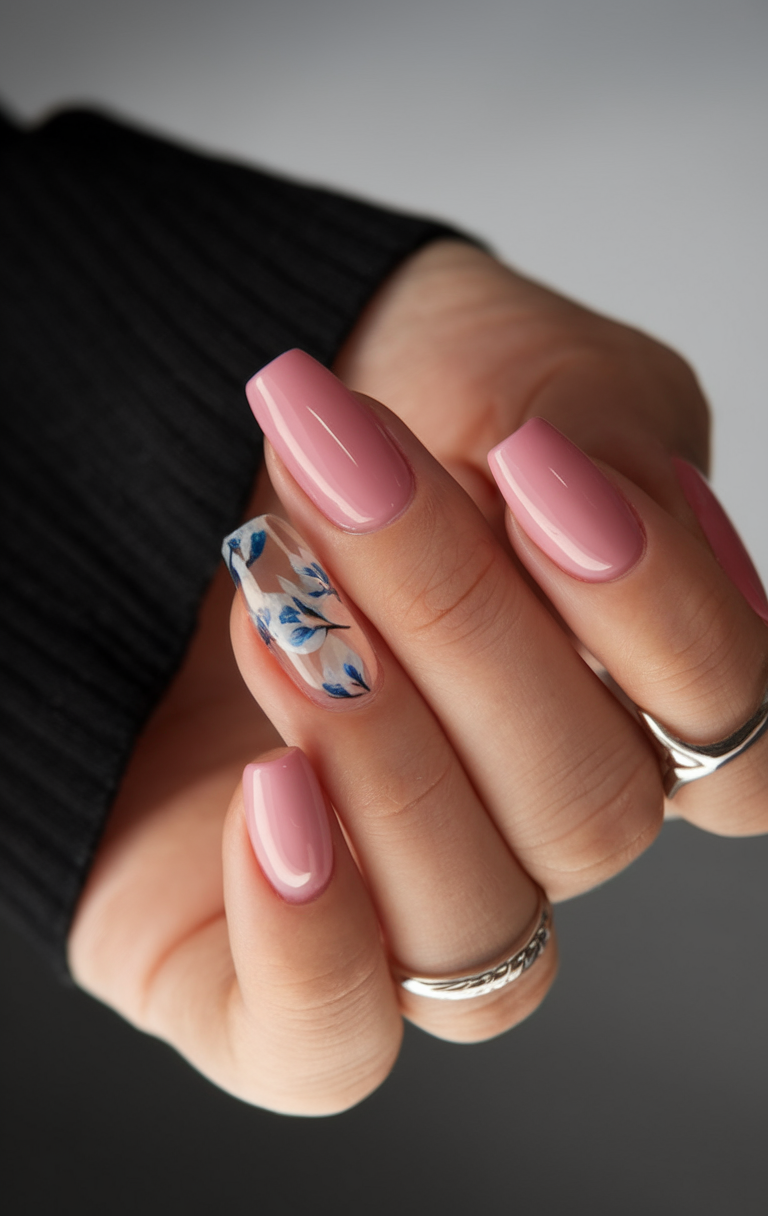 #18 Soft Pink Square Nails with Blue Floral Accent