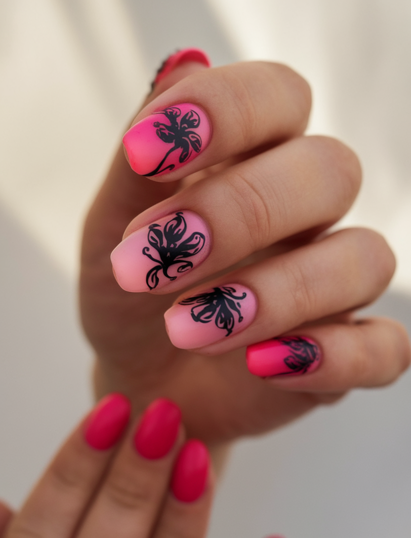This designs short set features a bold gradient of pink transitioning into a deep neon shade. The matte finish gives the nails a modern touch, while the black floral designs add an artistic edge. The short round shape keeps this look practical yet stylish, making it perfect for spring acrylic nails ideas 2025. Ideal for those who love vibrant colors with a delicate yet striking design.