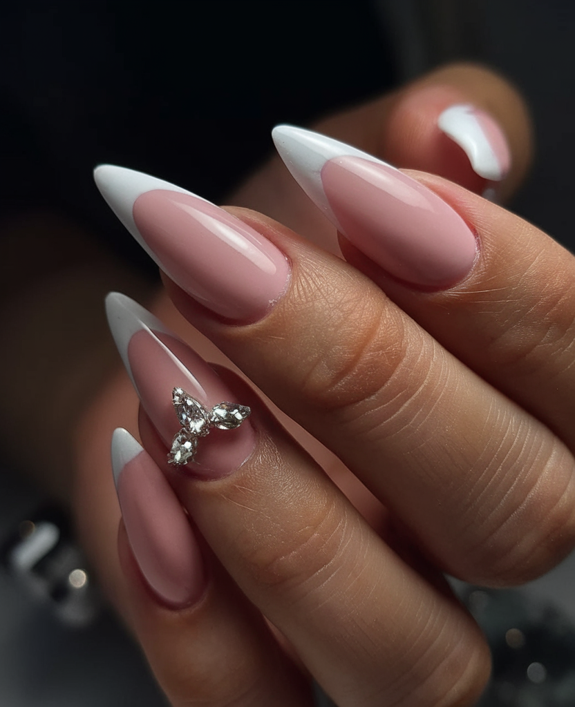 A timeless short french nail set, this look blends a soft pink base with crisp white tips in an elongated designs almond shape. The glossy finish enhances the natural beauty, while a delicate crystal accent adds a touch of luxury. This simple classy elegant manicure is perfect for those who appreciate minimalism with a refined edge. A must-have inspo for lovers of timeless beauty in spring acrylic nails ideas 2025.