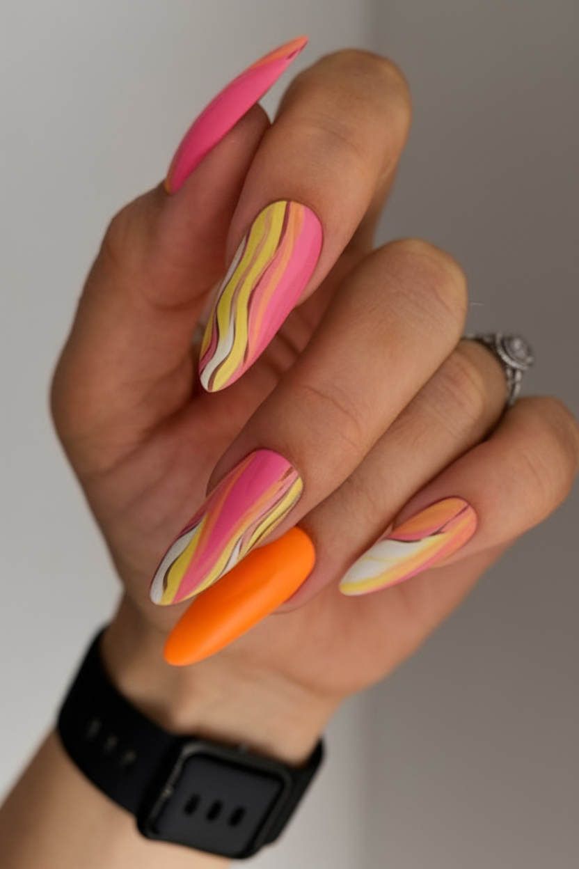 This designs coffin set brings a burst of energy with its neon pink, orange, and yellow swirls. The matte finish enhances the modern look, while the mix of solid and patterned nails creates a dynamic contrast. The abstract wavy lines give the nails a vibrant and fluid motion, making them an ideal spring acrylic nails ideas 2025. Perfect for those who love bold colors with an artistic twist.