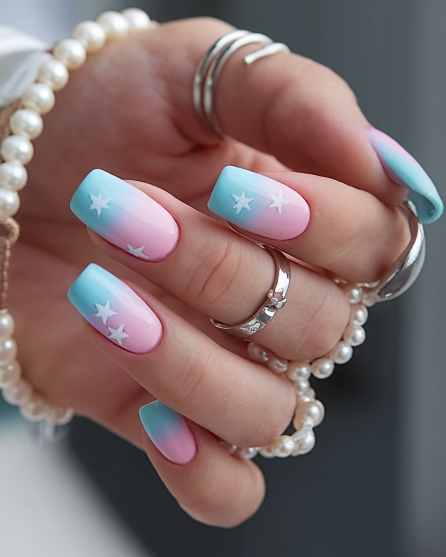 This square nail set features a dreamy pastel ombre blend of pink and blue, fading seamlessly into each other. The delicate white stars add a celestial touch, enhancing the ethereal look of these designs blue nails. The glossy finish gives them a polished shine, making them a standout square french option. This soft yet eye-catching spring acrylic nails ideas 2025 set is ideal for those who love a whimsical aesthetic.