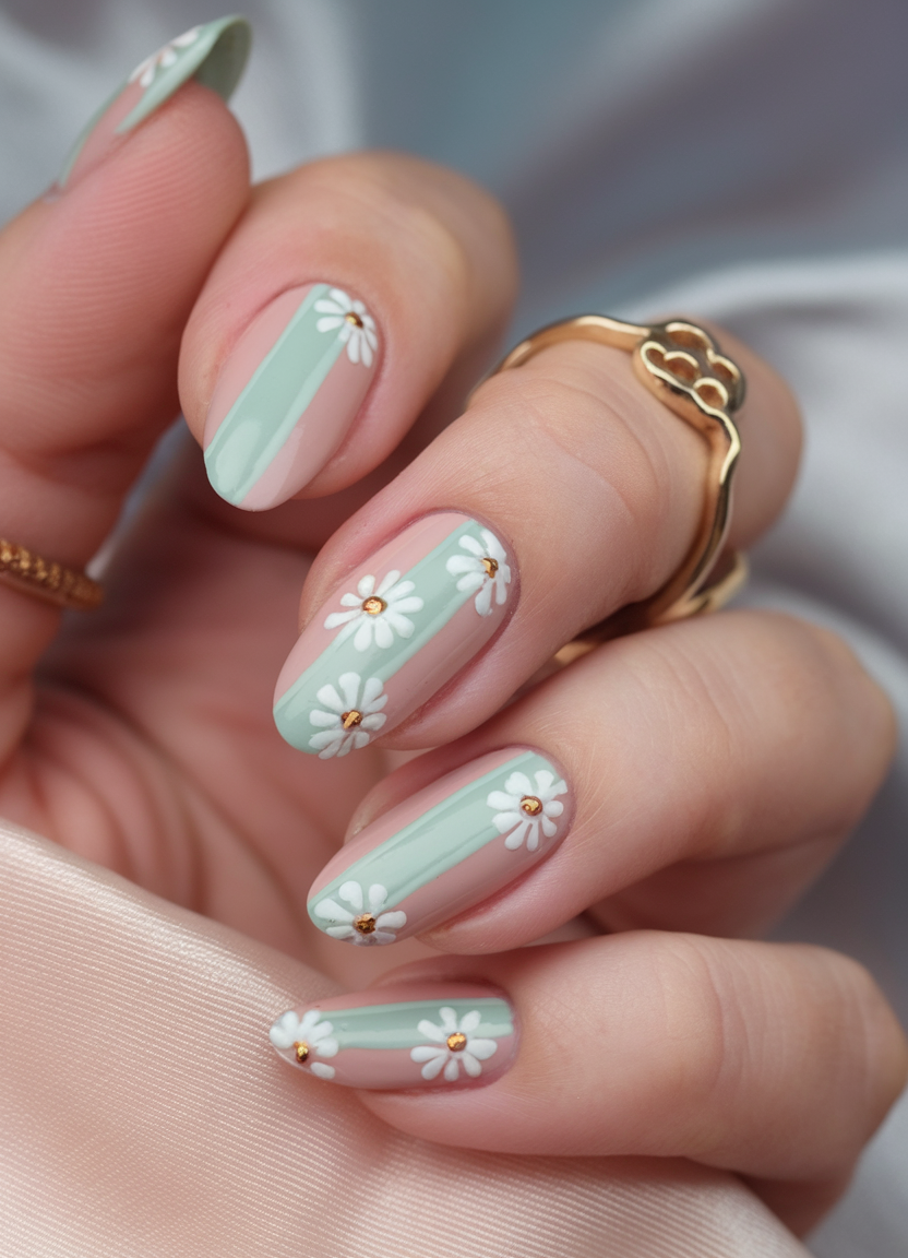 This designs short manicure features a delicate pastel green and pink split design, adorned with tiny white daisy accents. The flowers, with golden centers, add a fresh and feminine touch, making this a perfect spring acrylic nails ideas 2025 look. The smooth glossy finish enhances the contrast between the muted colors and the floral detailing, making these designs flowers an elegant yet playful choice.