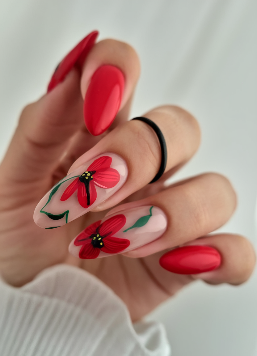 A striking designs almond set with a rich red base and hand-painted flower details. The deep red petals, outlined in black, stand out against the sheer base, creating a dramatic yet refined floral effect. The glossy finish adds depth to the design, making these simple classy elegant nails a bold but wearable choice. The mix of solid and art-focused nails balances sophistication with creativity.