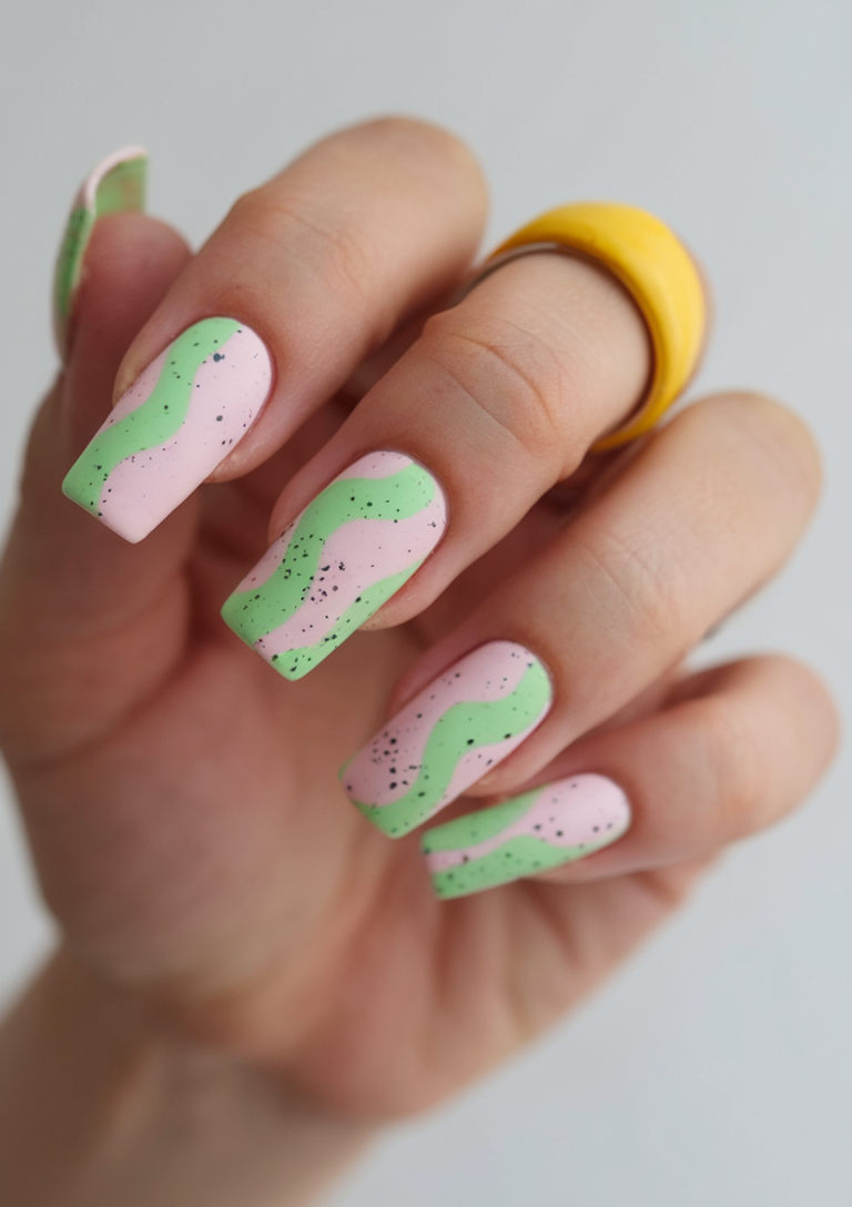 This designs square set features soft pink and fresh green wavy patterns, accented with tiny black speckles for added texture. The matte finish enhances the modern feel, giving these square french nails a trendy, artistic touch. The design mimics a playful yet structured look, making it a unique choice for those who love bold color contrasts with an organic flow.