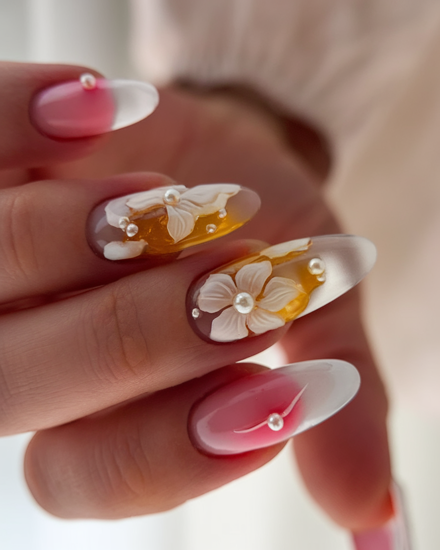 These breathtaking nails feature a mix of translucent and glossy finishes, enhanced by 3D floral designs and encapsulated amber-like gel accents. The soft pink base transitions into a milky white gradient on some nails, adding a dreamy touch. Delicate pearl embellishments complete the intricate detailing, creating a luxurious, ultra-feminine effect.