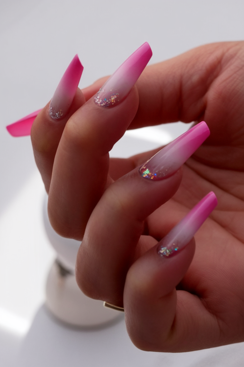 A timeless and elegant design, this pink ombre manicure features a seamless gradient that fades from a deep, vibrant pink into a natural sheer base. Delicate iridescent glitter is concentrated near the cuticle, catching the light for a subtle sparkle. The nails are long and coffin-shaped, enhancing the graceful, elongated look of the hands. The glossy top coat ensures a high-shine finish, making this style a dreamy yet sophisticated choice.