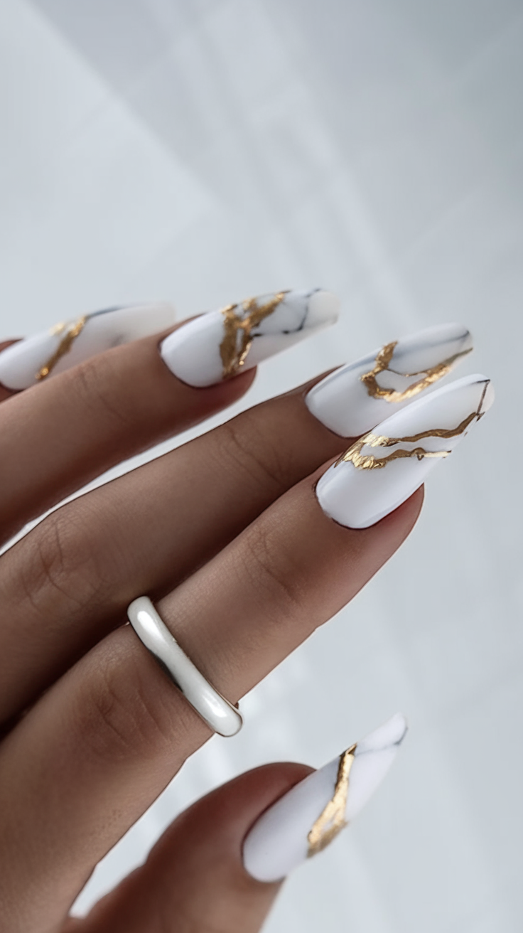 An effortlessly chic and luxurious design, this marble-inspired manicure features a crisp white base with delicate black veining, mimicking the look of natural stone. Thin strokes of gold foil enhance the elegance, creating a refined and slightly edgy aesthetic. The coffin shape complements the sleek, modern feel, while a matte top coat keeps the look sophisticated and elevated. This design is ideal for those who love minimalism with a touch of opulence.