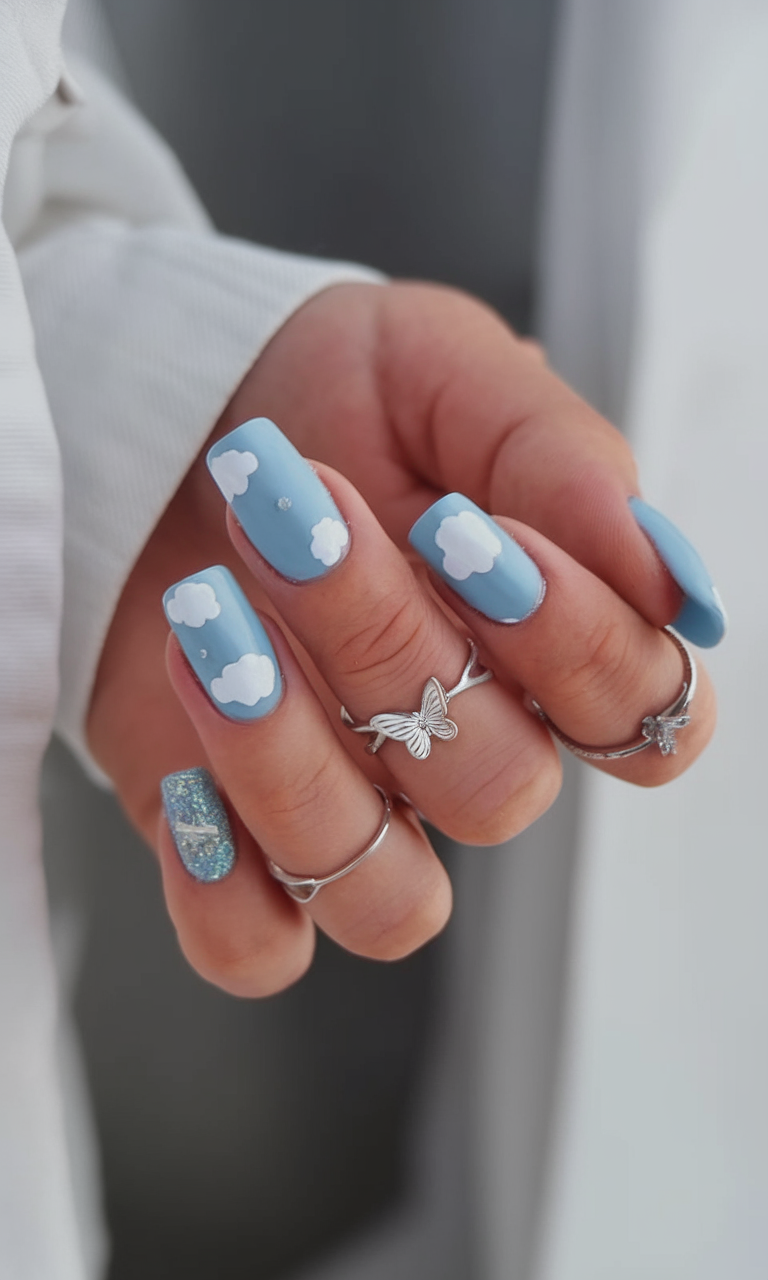 Soft and whimsical, this manicure features a pastel blue base that sets the stage for delicate hand-painted white clouds. The airy, ethereal look is enhanced with a single accent nail covered in fine, silver glitter, adding a dreamy shimmer. The square shape gives the design a fresh, modern feel, perfect for anyone who loves soft aesthetics with a playful twist. This nail art captures the serene beauty of a clear spring sky, making it an eye-catching yet calming choice.