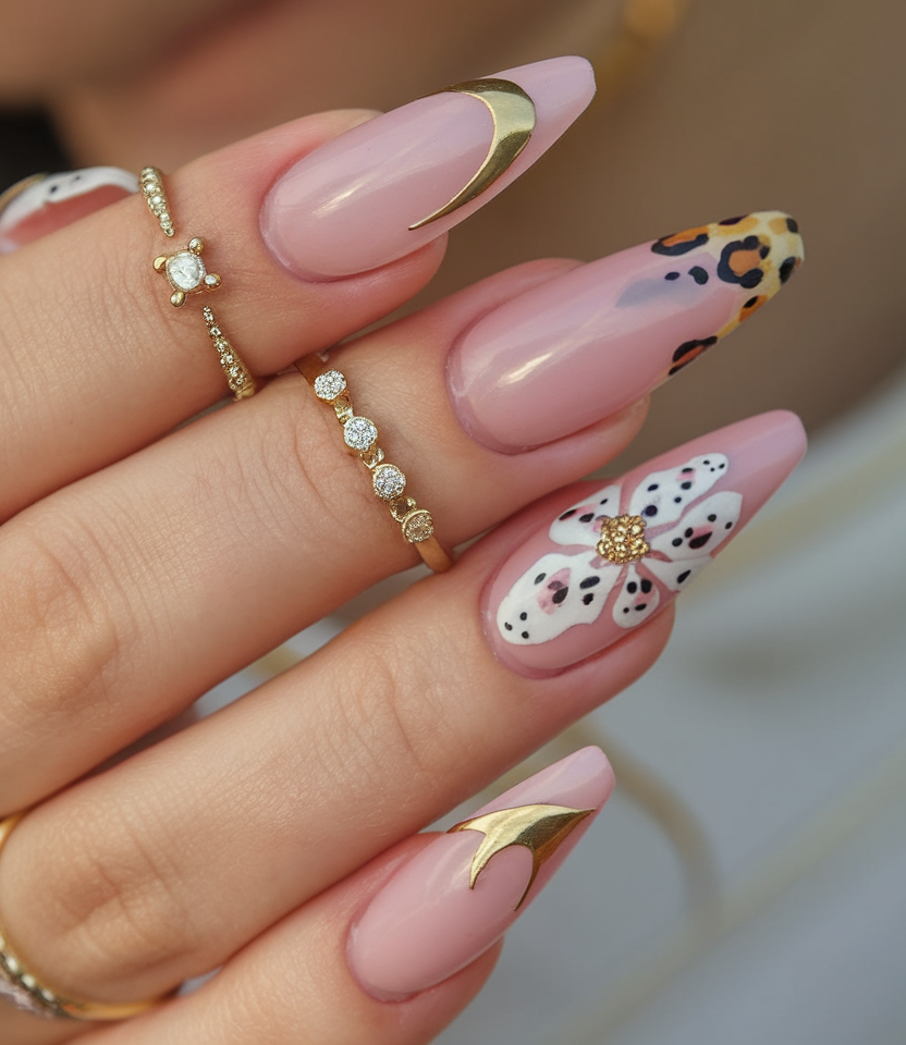 A luxurious designs coffin set, these nails showcase a soft pink base with intricate gold accents. The 3D floral embellishments, metallic filigree, and textured prints add depth and elegance. The designs pink elements combine both artistic and regal aesthetics, making this manicure a simple classy elegant statement. This is an eye-catching choice for anyone who loves intricate, jewelry-inspired nail art.