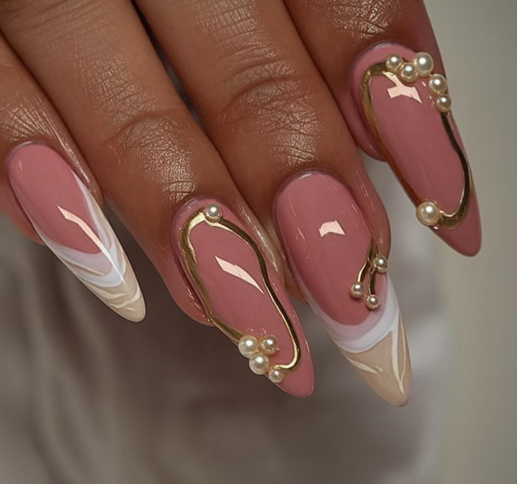 A luxurious twist on designs almond, this set features a deep pink base with intricate pearl and gold embellishments. The square french swirl accents in white and nude create a soft, flowing contrast against the bold metallic details. The pearl placements add dimension, making this an elegant choice for those who love simple classy elegant nails. This inspo is a statement piece for anyone looking for a sophisticated yet artistic manicure.