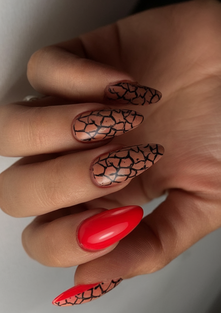 This designs almond set combines a dramatic cracked-earth effect with a bold, glossy red accent. The intricate black crackle design on a nude base creates a raw, artistic texture, contrasting sharply with the high-shine red nails. The simple classy elegant look of the solid red adds a modern touch, making it a unique spring acrylic nails ideas 2025. This edgy combination is ideal for those who love a mix of soft neutrals and striking details.