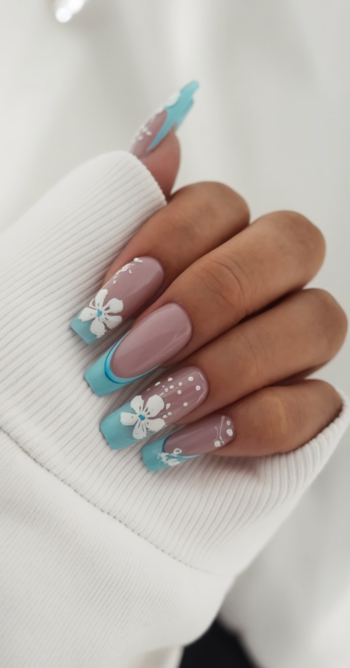 A fresh take on square french, this set blends soft nude and vibrant blue tips with hand-painted floral details. The delicate designs flowers add a spring-ready touch, enhanced by subtle white dots and swirls for extra elegance. The glossy finish keeps the nails looking sleek, making this designs blue set a beautiful inspo for anyone who loves a light, feminine manicure. Perfect for those seeking designs square with a fresh seasonal feel.