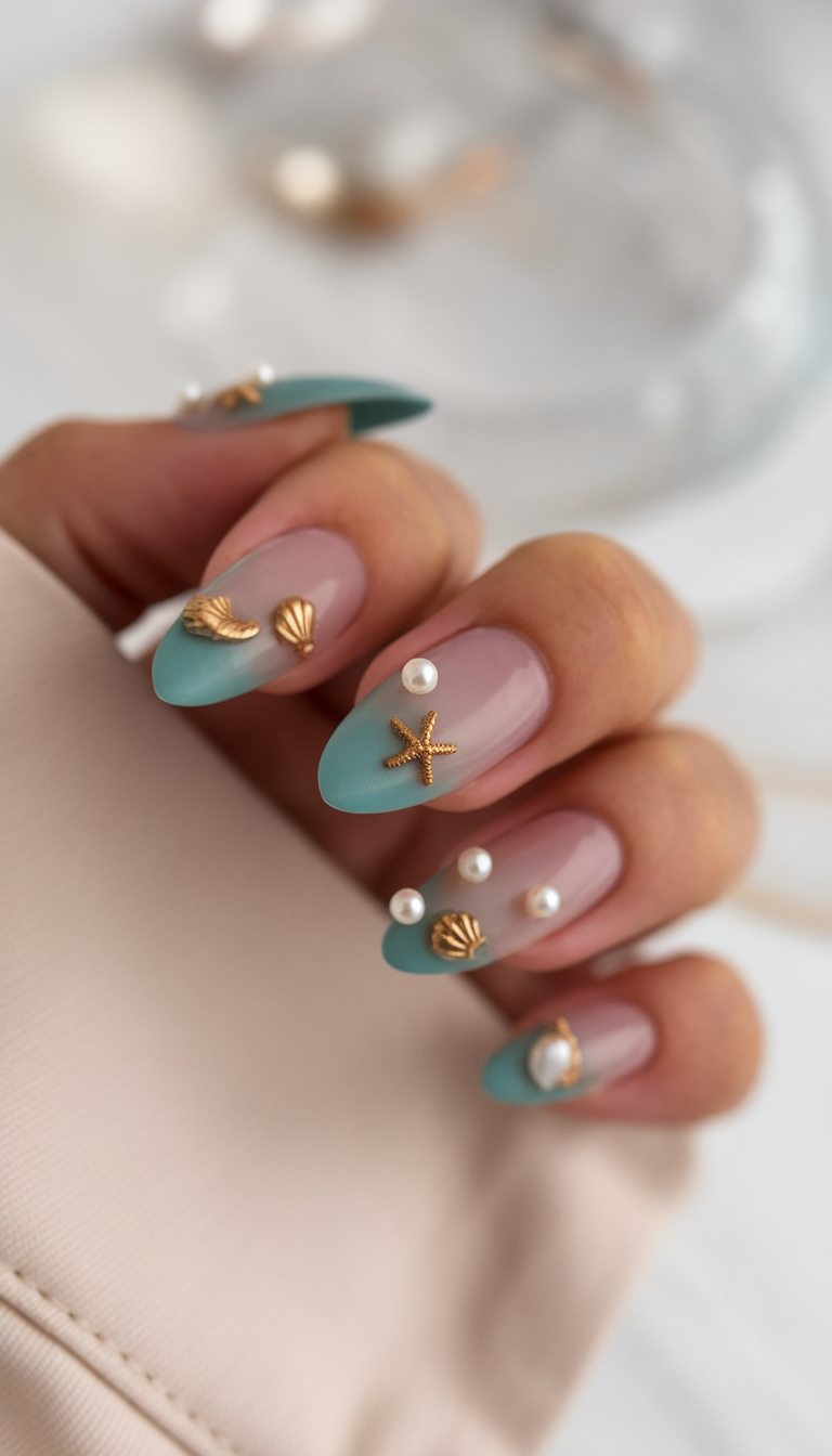 #20 Ocean-Inspired Pearl and Gold Accent Nails