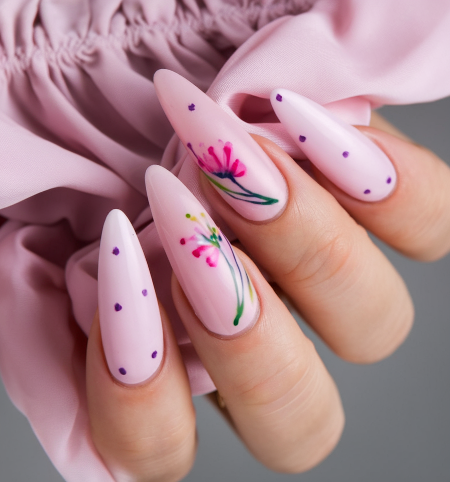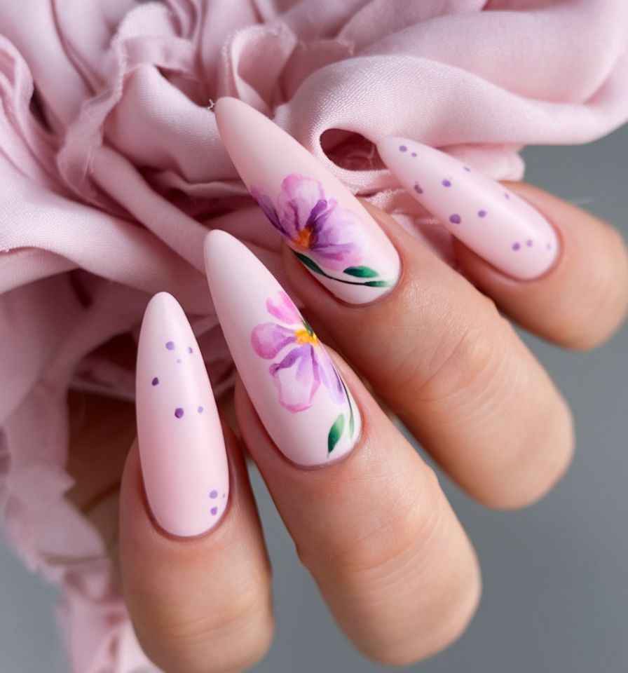 A delicate almond shape and soft pink base make this set effortlessly elegant. The art purple flowers stand out beautifully, hand-painted with a watercolor effect that adds depth. Small purple dots add a simple yet stylish accent, keeping the look fresh and modern. This design is perfect for those who love spring floral nails ideas 2025 with a soft, feminine touch.