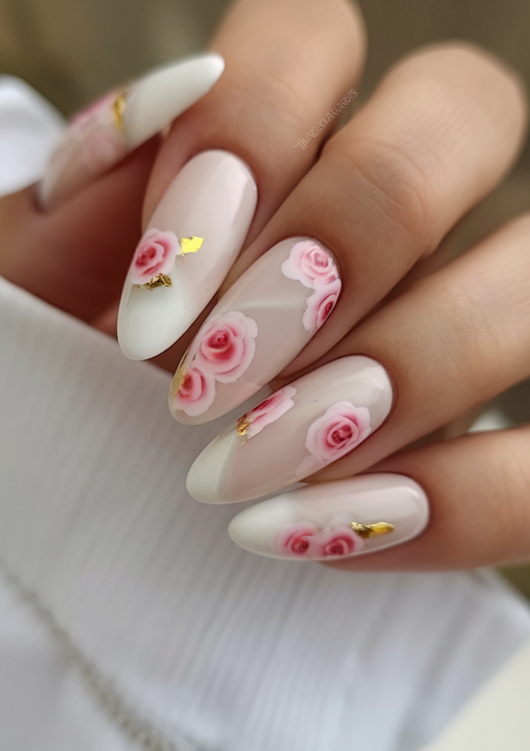 This classy French tip design features a soft nude base with delicately hand-painted pink roses. The art flowers are arranged in a natural pattern, blending seamlessly with the neutral background. Gold foil accents add a luxurious touch, making this a perfect trendy choice for spring floral nails ideas 2025. The almond shape keeps the overall look elegant and feminine, making it ideal for those who love timeless floral designs.