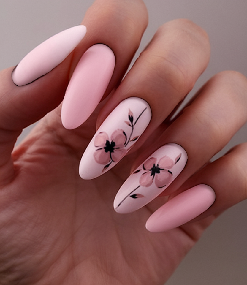 A beautiful design cherry blossoms look, this simple yet sophisticated set features a soft pink matte base. The black-stemmed floral art flowers are delicately painted on two nails, creating a perfect balance of minimalism and detail. The shaped almond tips give this design a modern feel, while the subtle contrast between the matte and glossy textures adds depth. This is a great 2025 short nail inspiration for those who prefer soft yet artistic designs.