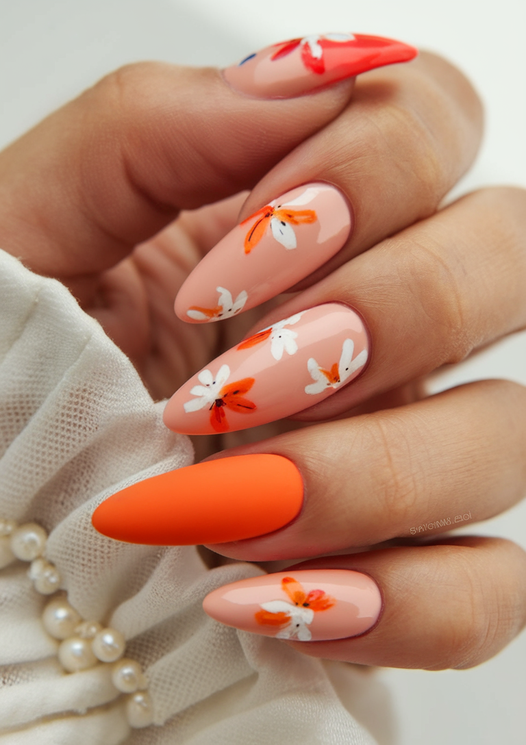This bold trendy set plays with color, featuring a peachy nude base adorned with white and orange art flowers. A bright matte acrylic orange accent nail adds a pop of contrast, making the design feel playful and fresh. The floral details, painted in an effortless brushstroke style, give off a designs simple yet artistic effect. This is a fun, 2025 trends nail look for those who love a splash of color in their spring floral nails ideas 2025.