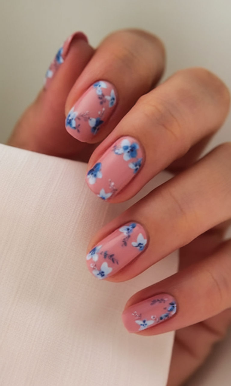 This sets short design features a dusty pink base with delicate hand-painted art flowers in soft blue. The detailed floral accents create a simple yet artistic effect, making these nails perfect for spring floral nails ideas 2025. The glossy finish enhances the intricate flower strokes, giving the design an elegant yet fresh appeal. Ideal for those who love trendy yet understated floral nail designs.