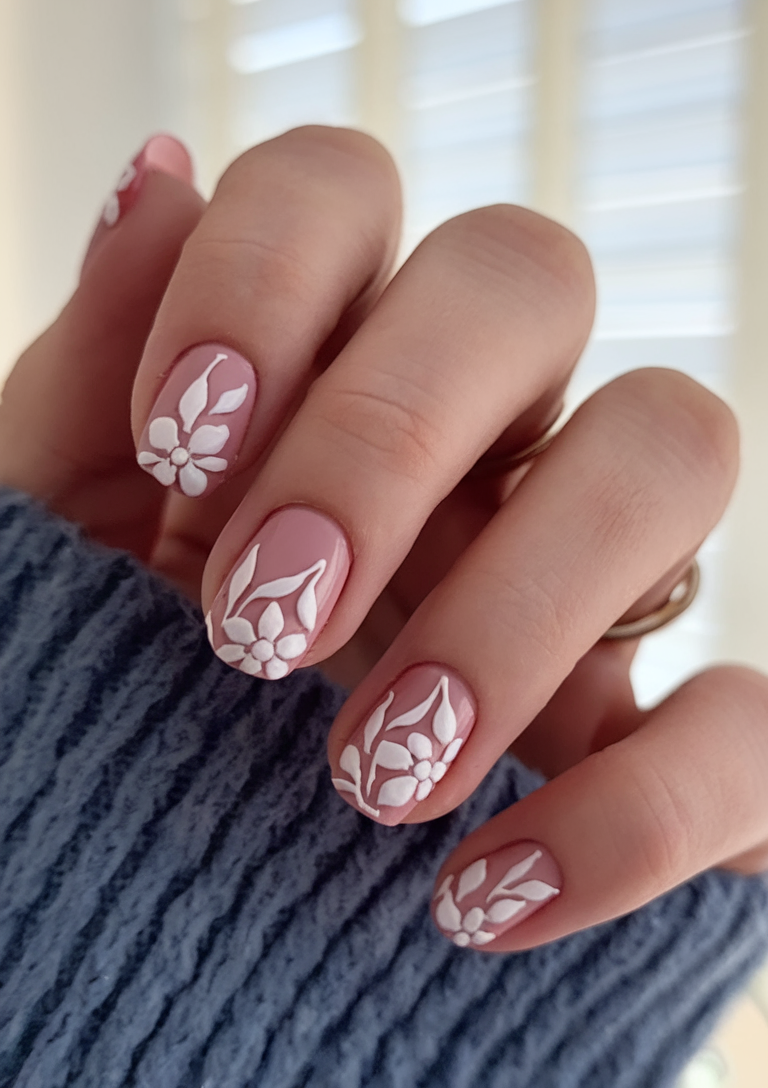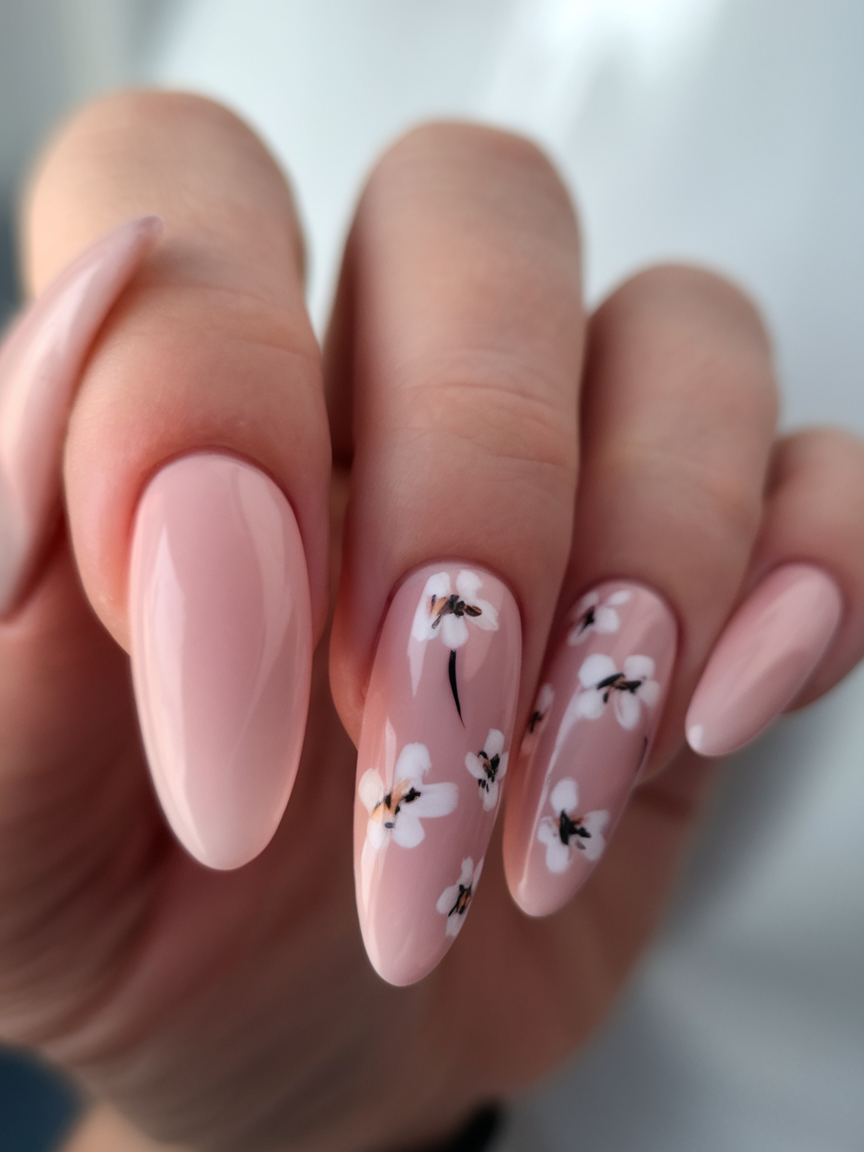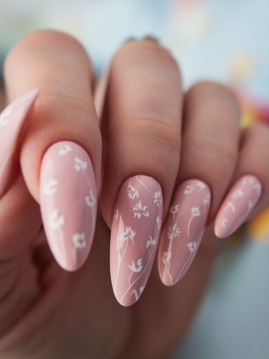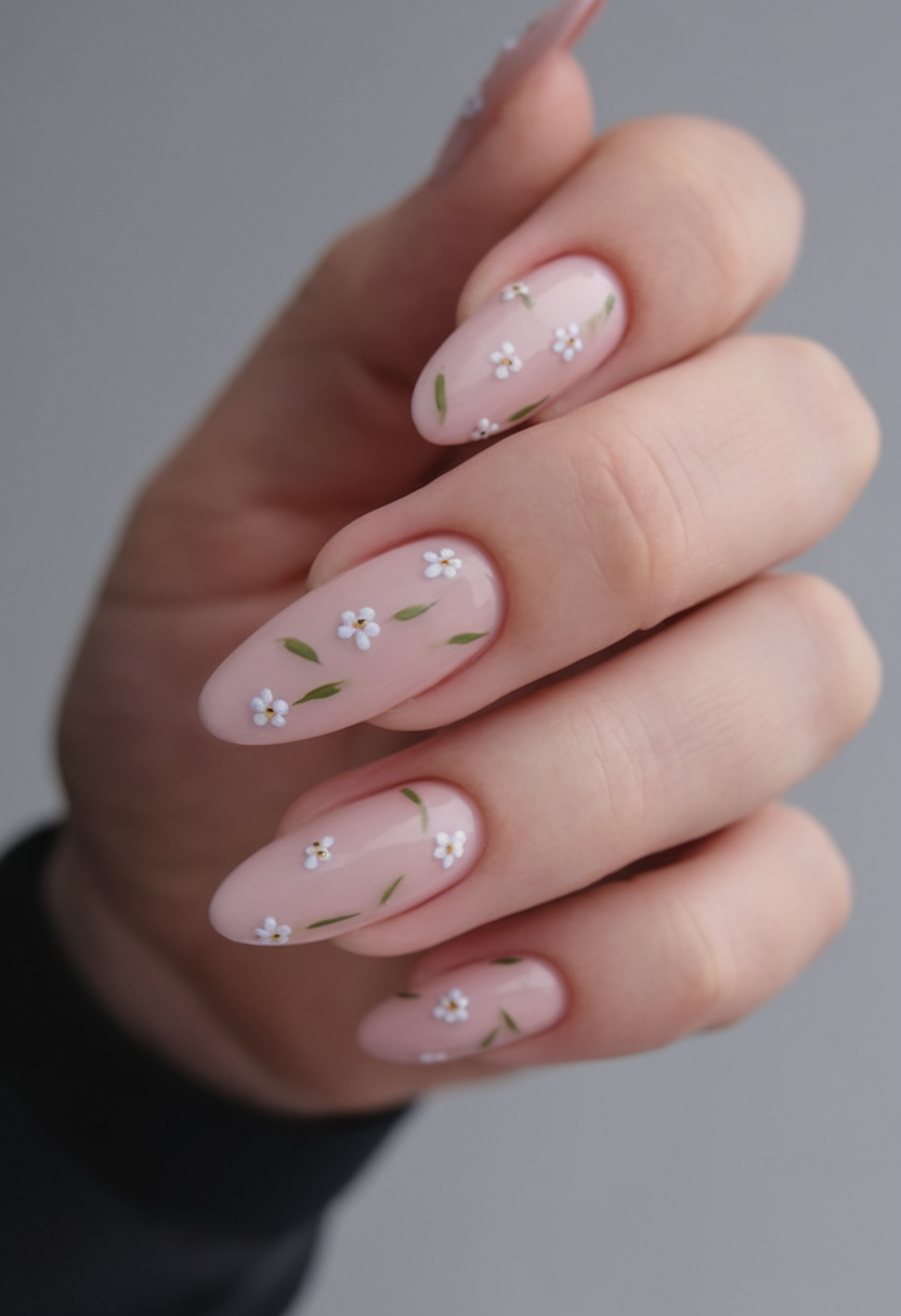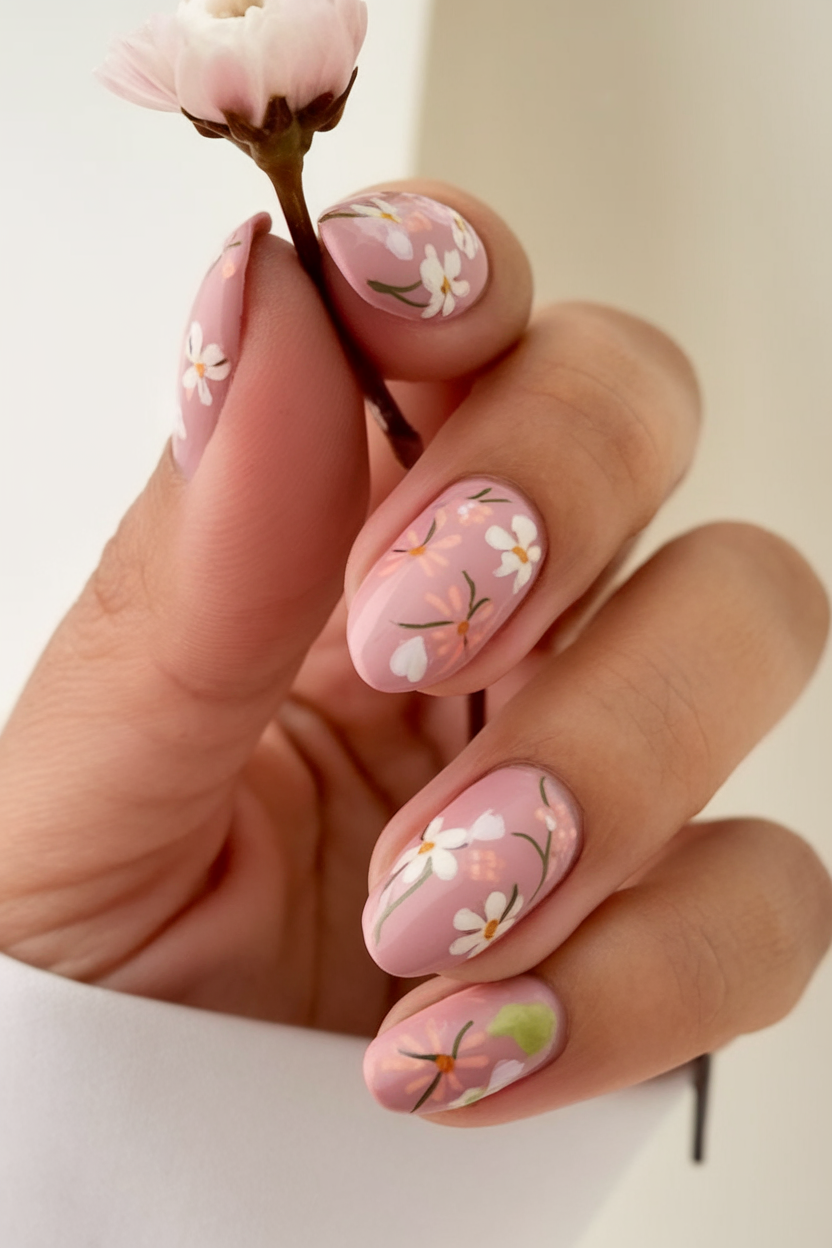 This romantic pink manicure features hand-painted white flowers with tiny yellow centers, creating a delicate springtime vibe. The flowers are strategically placed to look like they’re growing naturally across the nails. A rounded almond shape keeps the design soft and feminine, complementing the gentle pastel hues.