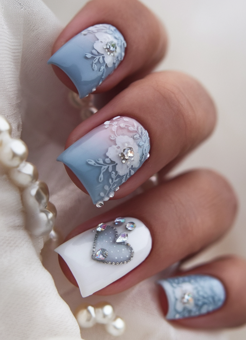 This luxurious acrylic set combines a gradient blue and white base with intricate 3D art flowers. Raised lace-like floral details and sparkling rhinestones add texture, giving the nails an opulent feel. A soft, heart-shaped accent on one nail adds an extra layer of charm, making this design perfect for spring floral nails ideas 2025. A standout choice for those who love trendy and classy statement nails.