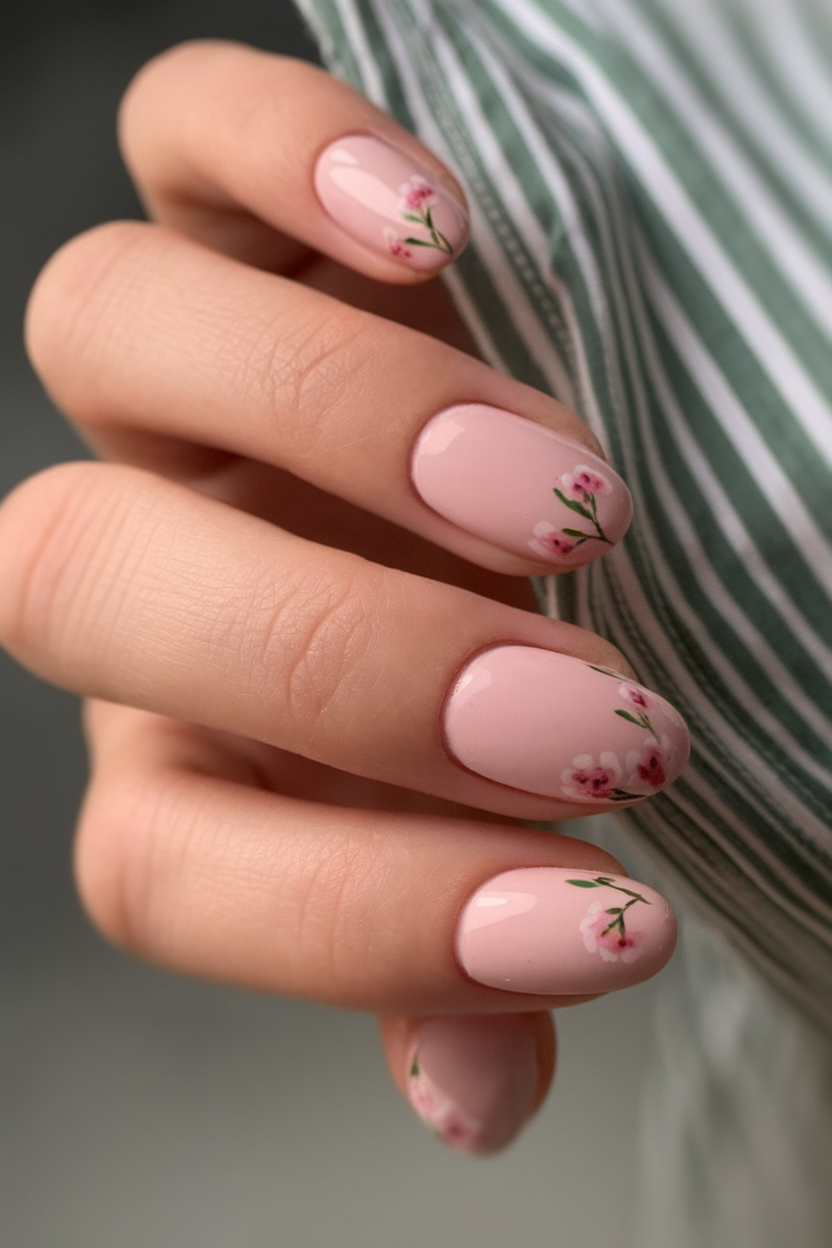 This sets short manicure features a soft pink base with tiny hand-painted art flowers on select nails. The delicate cherry blossom-inspired design keeps the look simple, yet refined, with its precise green stems adding contrast. The glossy finish enhances the soft and natural aesthetic, making it a perfect classy choice for spring floral nails ideas 2025. A great everyday floral design for those who love a subtle touch of nature.