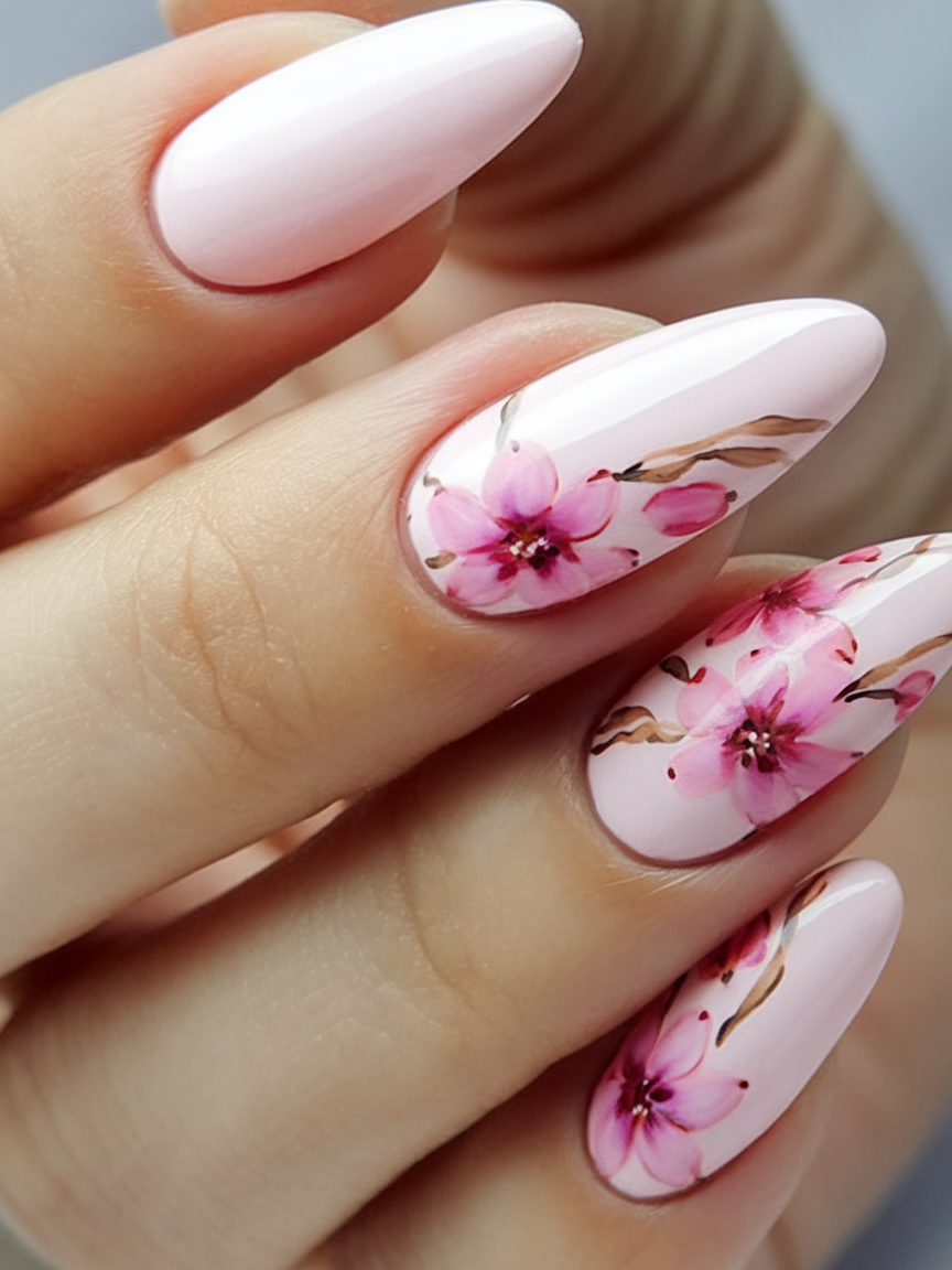 #11 Elegant Almond Nails with Cherry Blossom Art