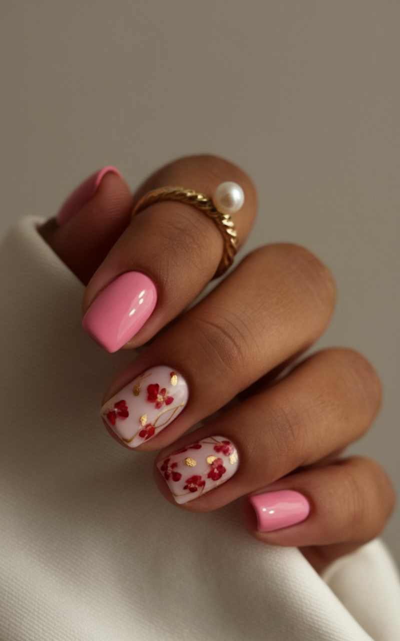 This classy squared acrylic set features a mix of glossy pink nails and white floral accent nails with rich red art flowers. The gold foil details add a touch of sophistication, making the design feel luxurious yet wearable. The designs simple layout keeps the flowers as the main focus, making this an ideal trendy option for spring floral nails ideas 2025. A perfect blend of elegance and creativity.