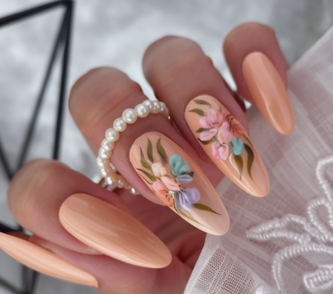 Soft peach tones create a delicate base for this floral nail art, giving a sophisticated yet lively feel. The acrylic nails are shaped into a perfect almond, elongating the fingers with a graceful curve. The focal point of this design is the 3D floral artwork, where petals in pastel hues of blue, pink, and lilac add depth and dimension. Paired with subtle green leaves, this look feels like a spring garden on your fingertips.