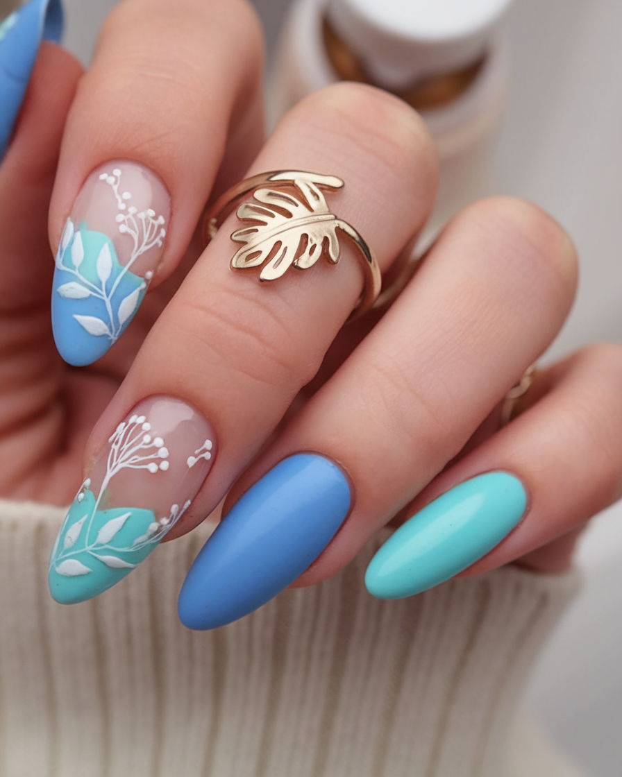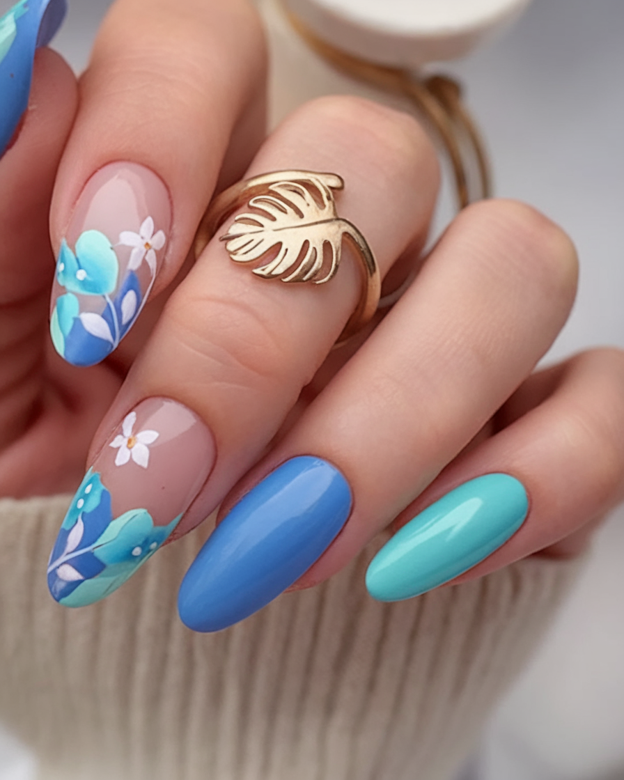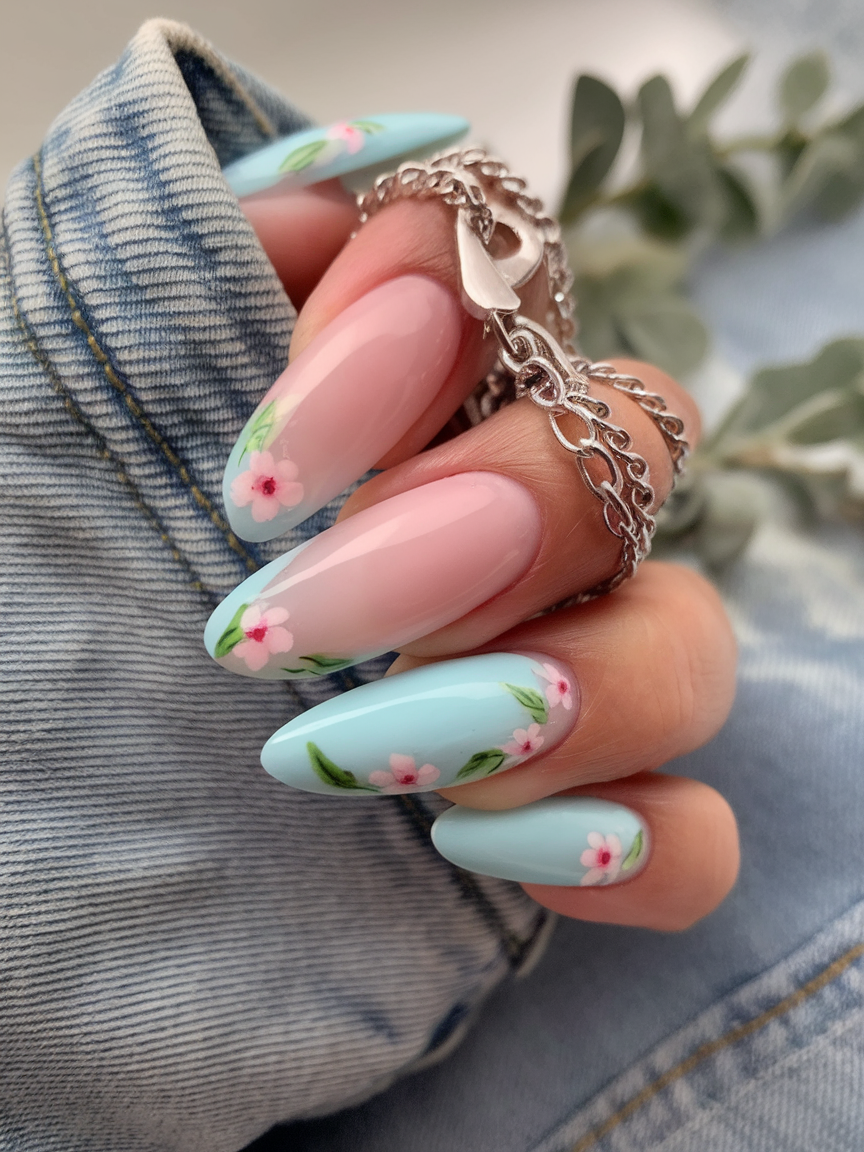 A dreamy spring floral nails ideas 2025 look, this design blends a French tip with delicate floral accents. The gradient pink-to-clear base transitions into soft pastel blue tips, creating a trendy ombré effect. Small, dainty pink flowers with hand-painted leaves are scattered across the nails, making this style both romantic and modern.