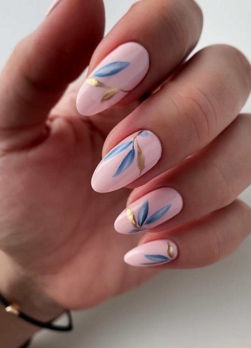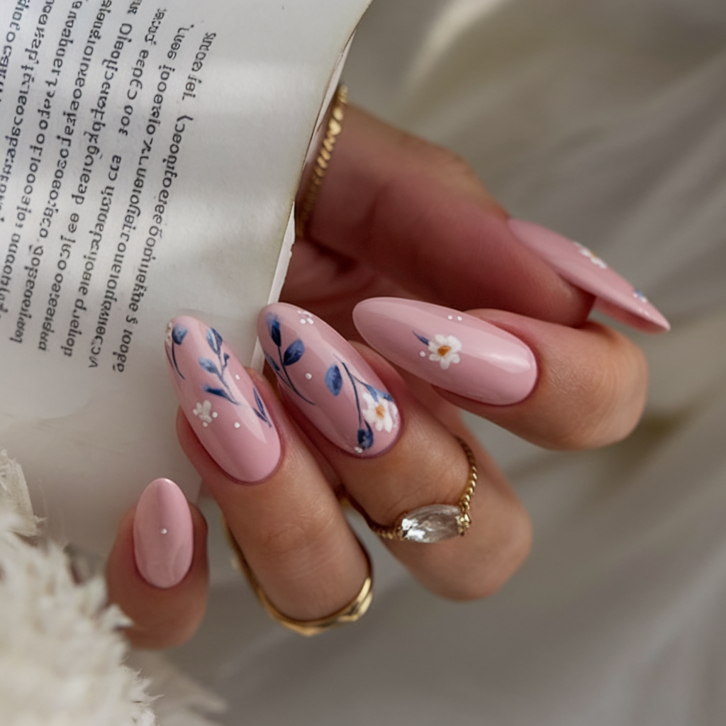 #24 Elegant Pink Almond Nails with Blue Floral Accents