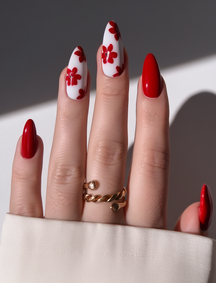 This bold nail design pairs glossy red polish with a crisp white base, creating a striking contrast. Two accent nails feature hand-painted red flowers, each with a small rhinestone at the center, adding a glamorous touch. The sharp almond shape enhances the edgy and fashion-forward appeal of this manicure.