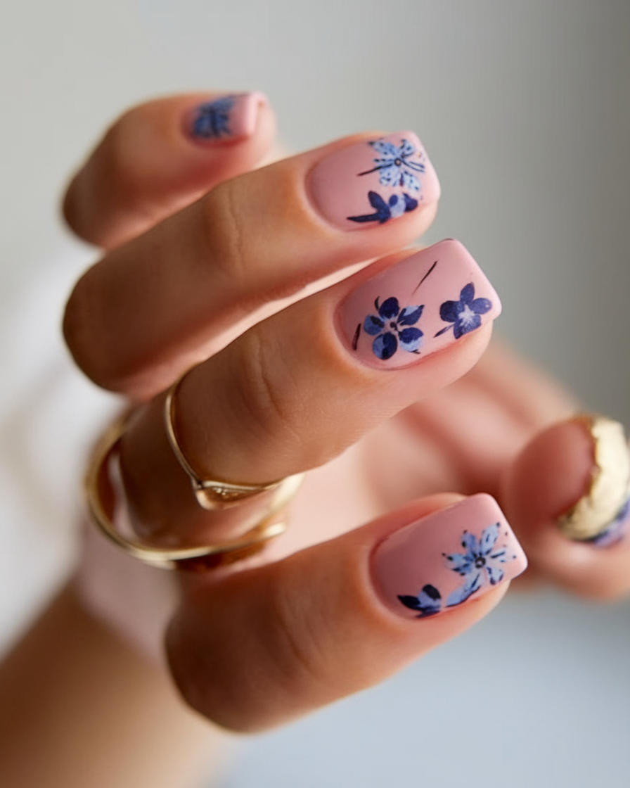 A soft pink nude base serves as the perfect backdrop for these deep blue floral accents. The short, square shape gives the nails a modern, practical feel, while the delicate floral details add a touch of whimsy. The flowers are painted in various shades of blue, with fine black branches giving the design a natural elegance.