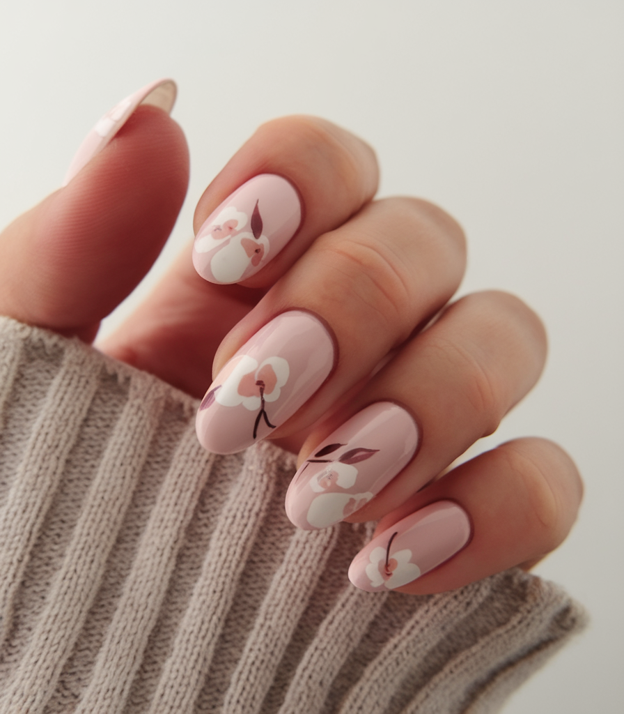 This delicate floral nail design features a soft blush pink base adorned with minimalist white flowers and fine brown stems. The petals are painted with a translucent effect, giving the flowers a watercolor-like appearance. The almond-shaped nails enhance the femininity of the design, while the subtle contrast of the brown stems keeps the overall aesthetic modern and chic.