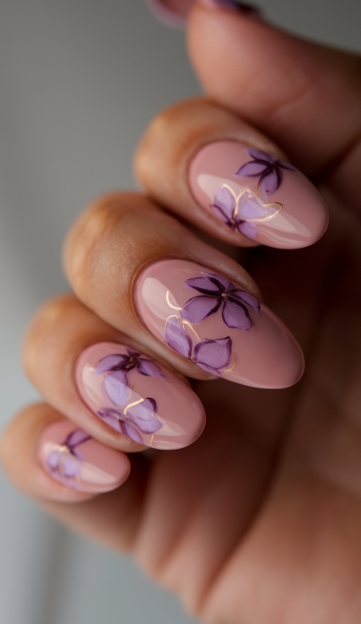 #27 Soft Pink Almond Nails with Purple Floral Art